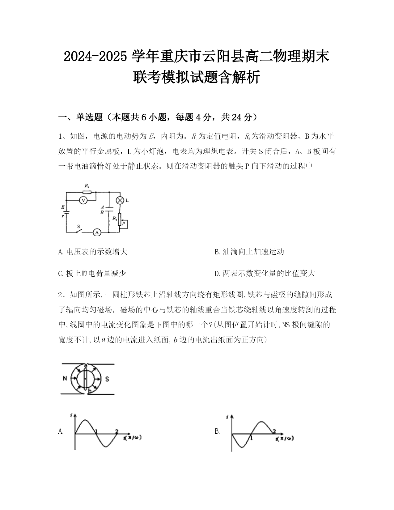 2024-2025学年重庆市云阳县高二物理期末联考模拟试题含解析.docx