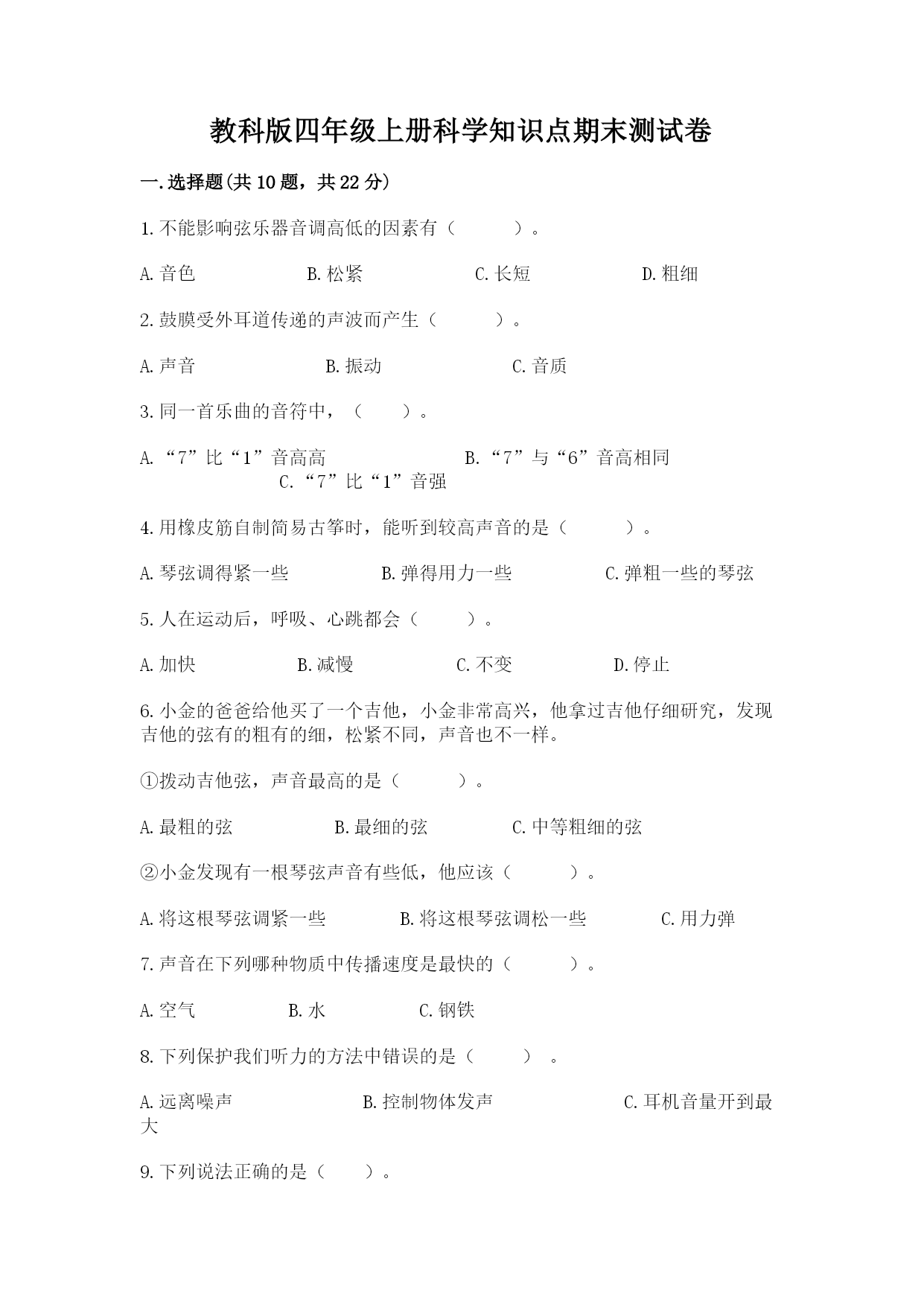 教科版四年级上册科学知识点期末测试卷一.选择题(共10题,共22分)1.不能影响弦乐器音调高低的因素有()。A.音色B.松紧C.长短D.粗细2.鼓膜受外耳道传递的声波而产生()。A.声音B.振动C.音质3.同一首乐曲的音符中,()。A.“7”比“1”音高高B.“7”与“6”音高相同C.“7”比“1”音强4.用橡皮筋自制简易古筝时,能听到较高声音的是()。A.琴弦调得紧一些B.弹得用力一些C.弹粗一些的琴弦5.人在运动后,呼吸、心跳都会()。A.加快B.减慢C.不变D.停止6.小金的爸爸给他买了一个吉他,小
