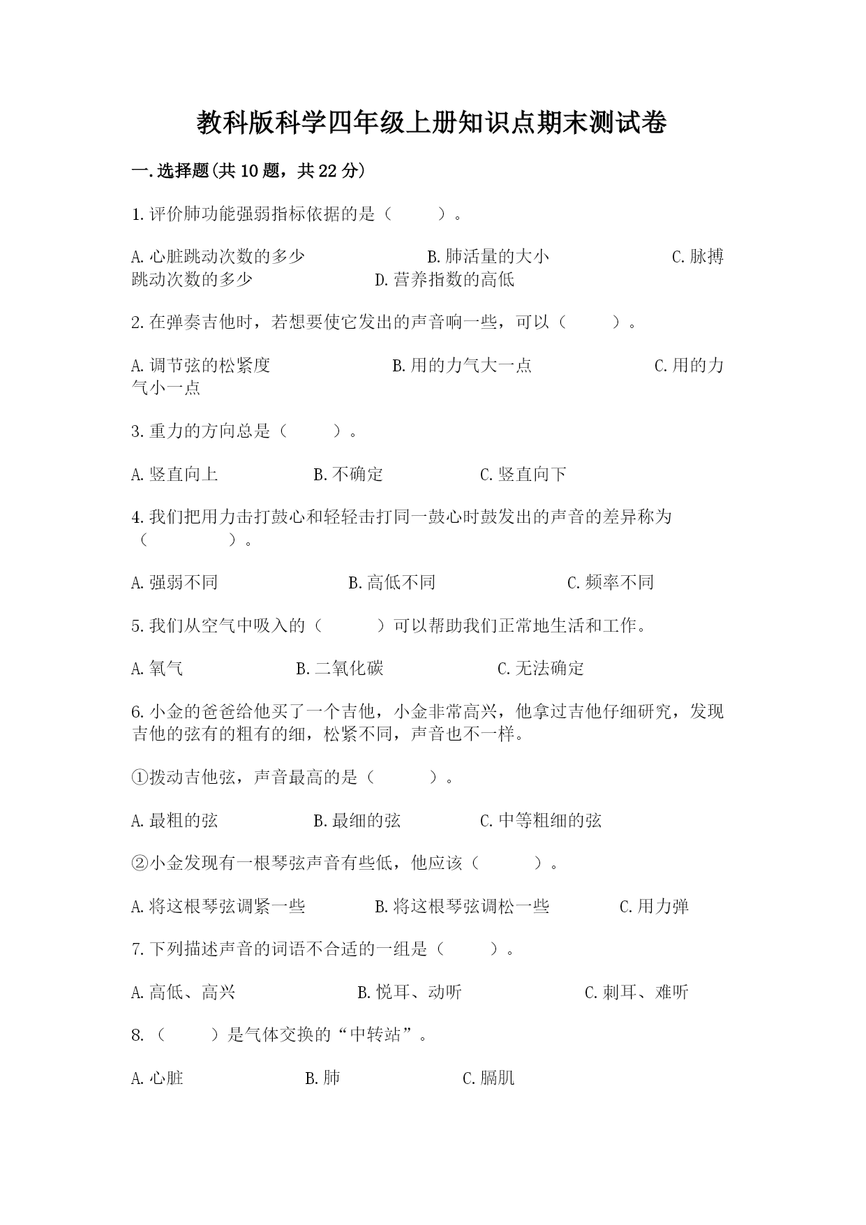 教科版科学四年级上册知识点期末测试卷一.选择题(共10题,共22分)1.评价肺功能强弱指标依据的是()。A.心脏跳动次数的多少B.肺活量的大小C.脉搏跳动次数的多少D.营养指数的高低2.在弹奏吉他时,若想要使它发出的声音响一些,可以()。A.调节弦的松紧度B.用的力气大一点C.用的力气小一点3.重力的方向总是()。A.竖直向上B.不确定C.竖直向下4.我们把用力击打鼓心和轻轻击打同一鼓心时鼓发出的声音的差异称为()。A.强弱不同B.高低不同C.频率不同5.我们从空气中吸入的()可以帮助我们正常地生活和工作