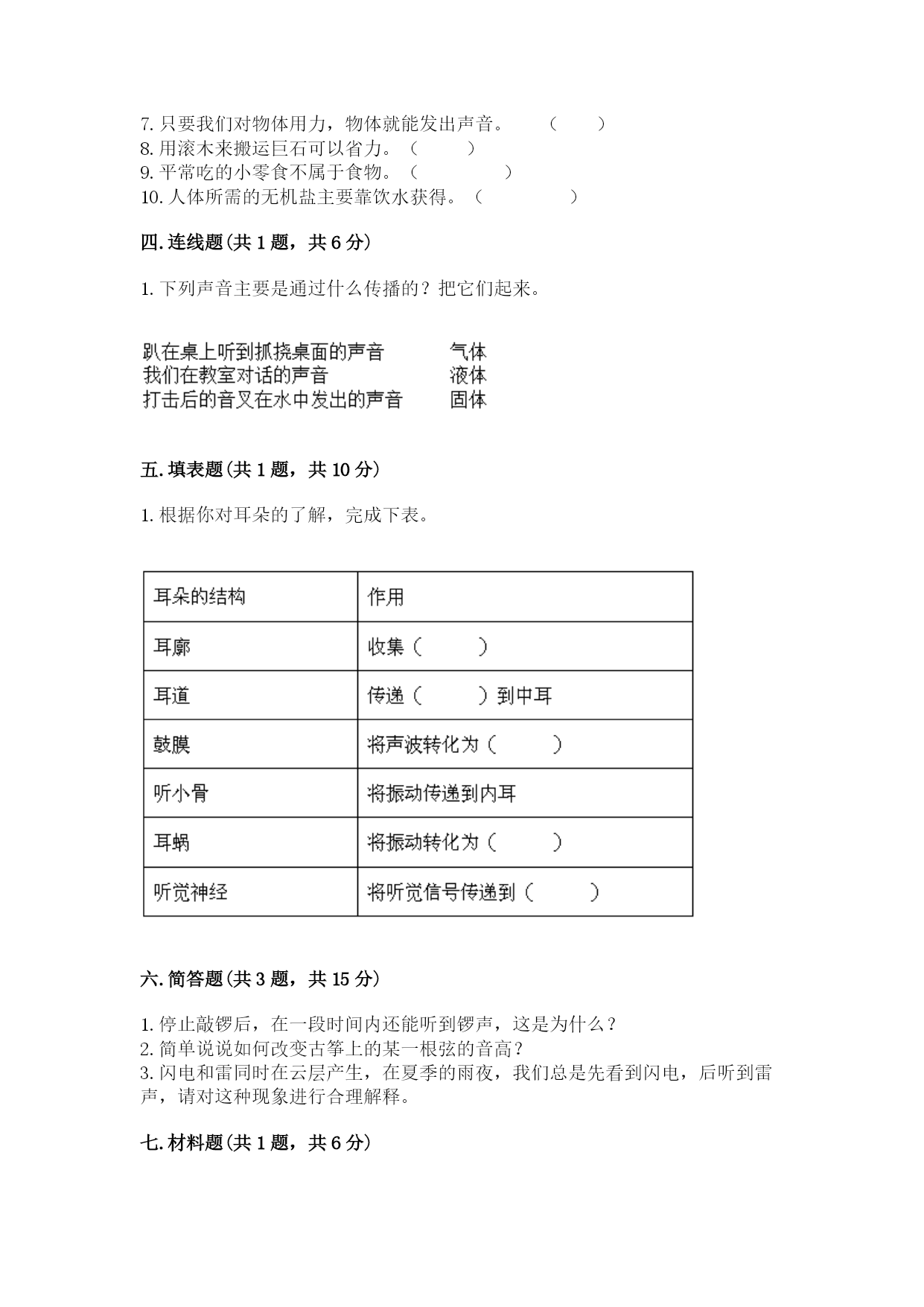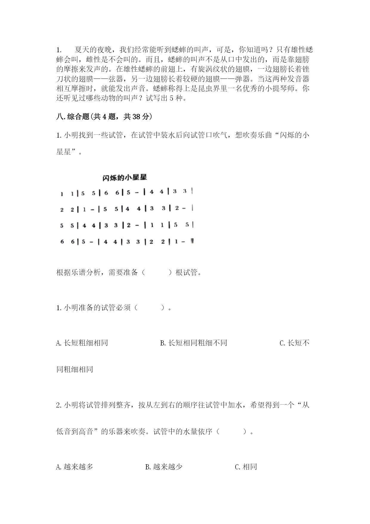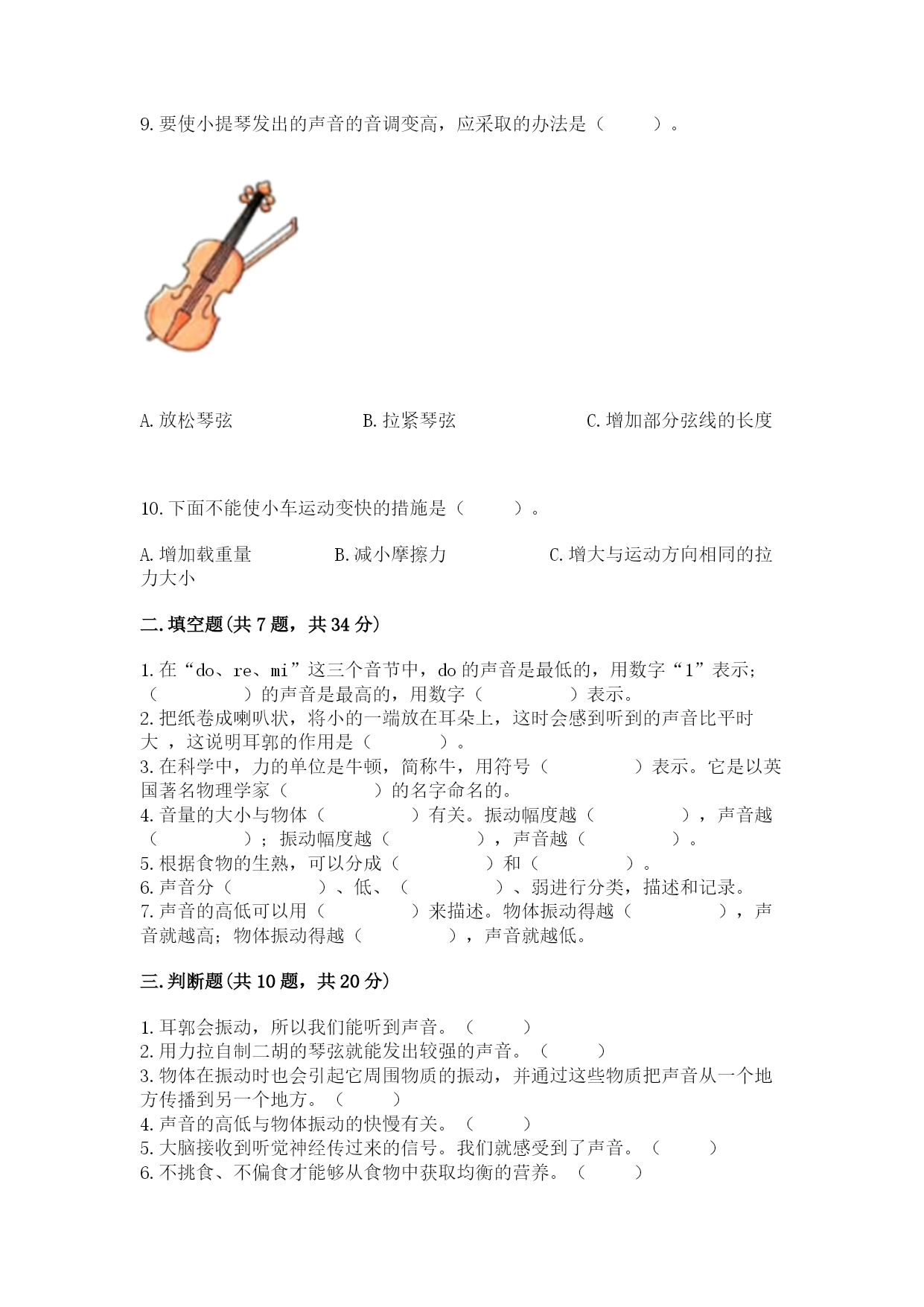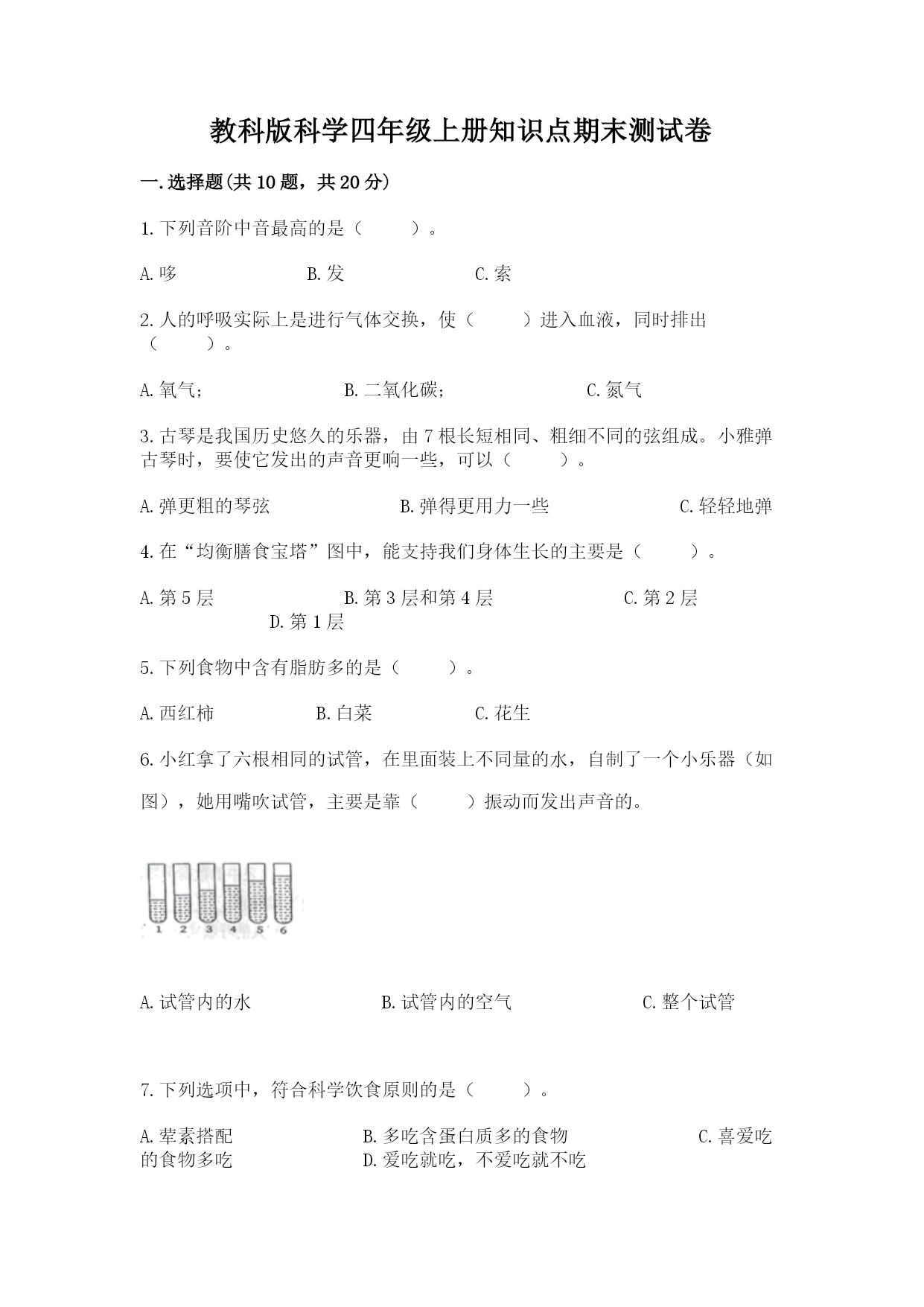 教科版科学四年级上册知识点期末测试卷一.选择题(共10题,共20分)1.下列音阶中音最高的是()。A.哆B.发C.索2.人的呼吸实际上是进行气体交换,使()进入血液,同时排出()。A.氧气;B.二氧化碳;C.氮气3.古琴是我国历史悠久的乐器,由7根长短相同、粗细不同的弦组成。小雅弹古琴时,要使它发出的声音更响一些,可以()。A.弹更粗的琴弦B.弹得更用力一些C.轻轻地弹4.在“均衡膳食宝塔”图中,能支持我们身体生长的主要是()。A.第5层B.第3层和第4层C.第2层D.第1层5.下列食物中含有脂肪多的是(