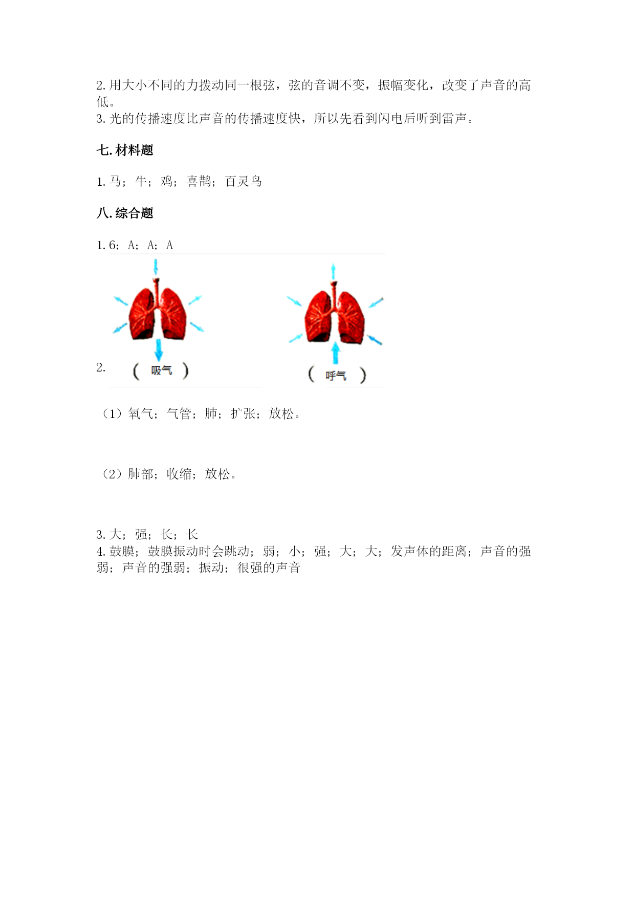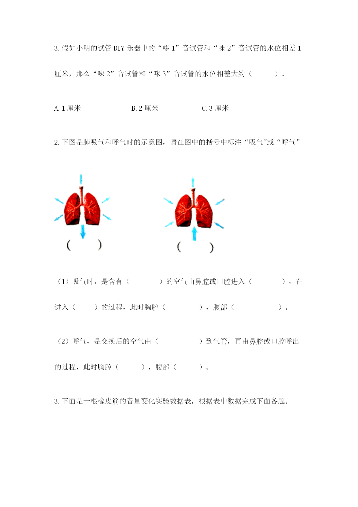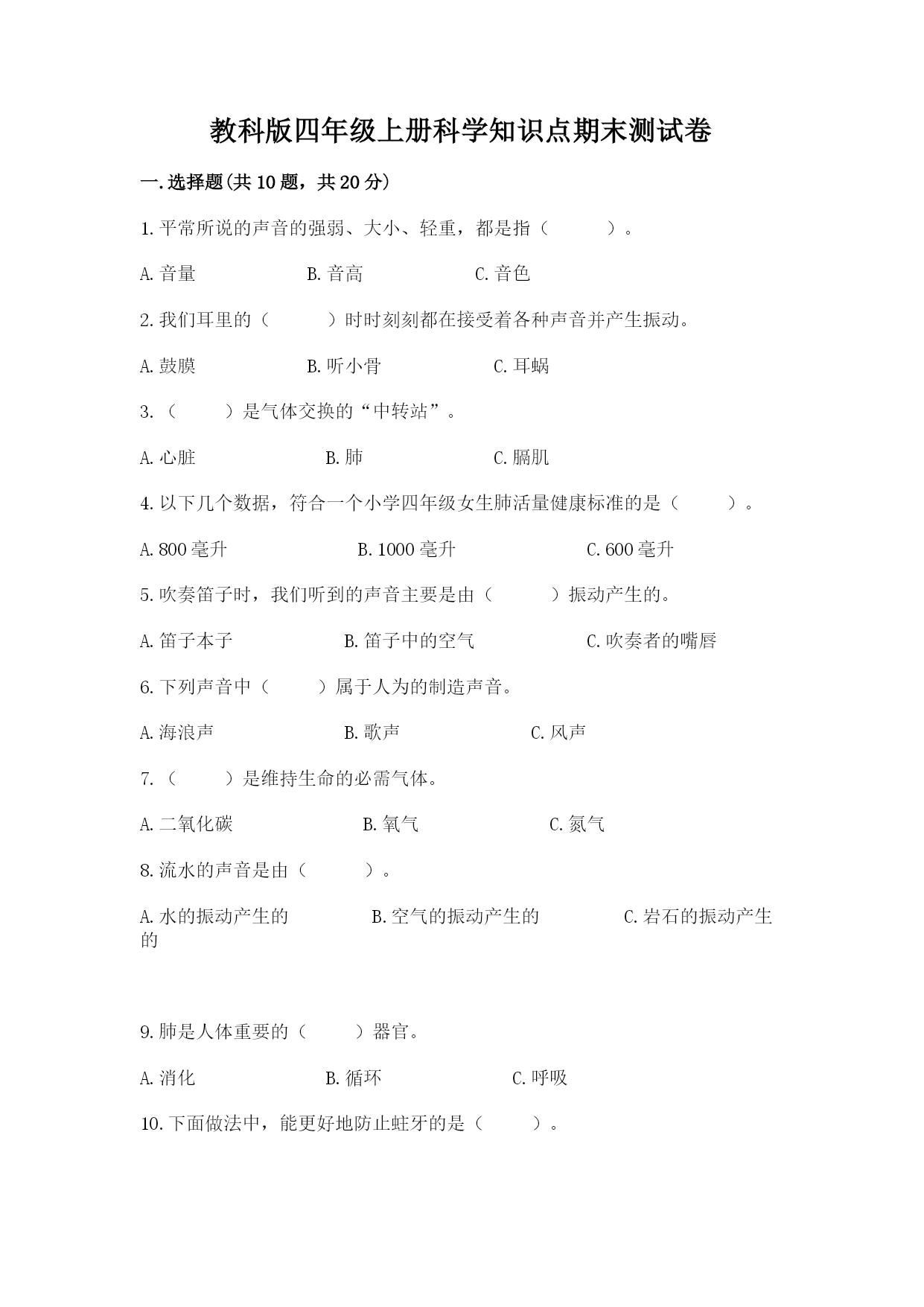 教科版四年级上册科学知识点期末测试卷一.选择题(共10题,共20分)1.平常所说的声音的强弱、大小、轻重,都是指()。A.音量B.音高C.音色2.我们耳里的()时时刻刻都在接受着各种声音并产生振动。A.鼓膜B.听小骨C.耳蜗3.()是气体交换的“中转站”。A.心脏B.肺C.膈肌4.以下几个数据,符合一个小学四年级女生肺活量健康标准的是()。A.800毫升B.1000毫升C.600毫升5.吹奏笛子时,我们听到的声音主要是由()振动产生的。A.笛子本子B.笛子中的空气C.吹奏者的嘴唇6.下列声音中()属于人为