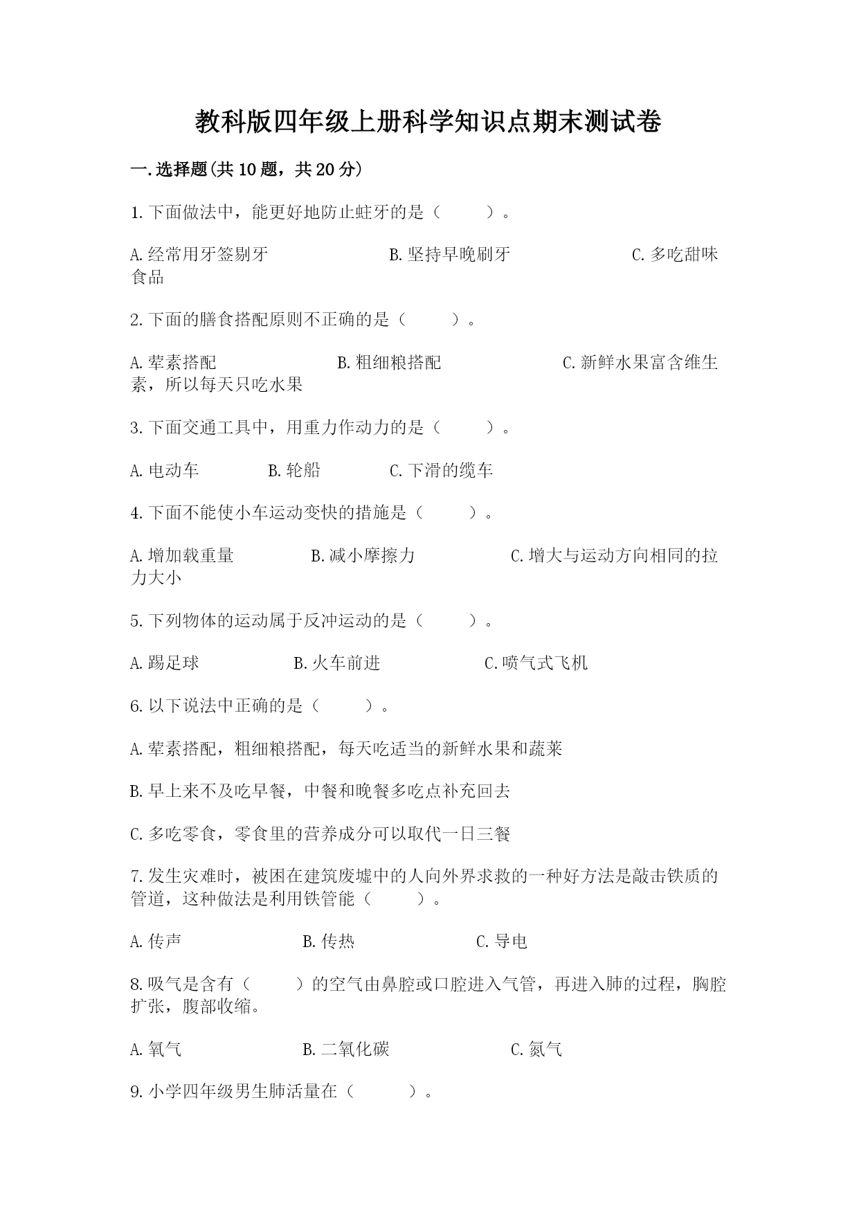 教科版四年级上册科学知识点期末测试卷一.选择题(共10题,共20分)1.下面做法中,能更好地防止蛀牙的是()。A.经常用牙签剔牙B.坚持早晚刷牙C.多吃甜味食品2.下面的膳食搭配原则不正确的是()。A.荤素搭配B.粗细粮搭配C.新鲜水果富含维生素,所以每天只吃水果3.下面交通工具中,用重力作动力的是()。A.电动车B.轮船C.下滑的缆车4.下面不能使小车运动变快的措施是()。A.增加载重量B.减小摩擦力C.增大与运动方向相同的拉力大小5.下列物体的运动属于反冲运动的是()。A.踢足球B.火车前进C.喷气式