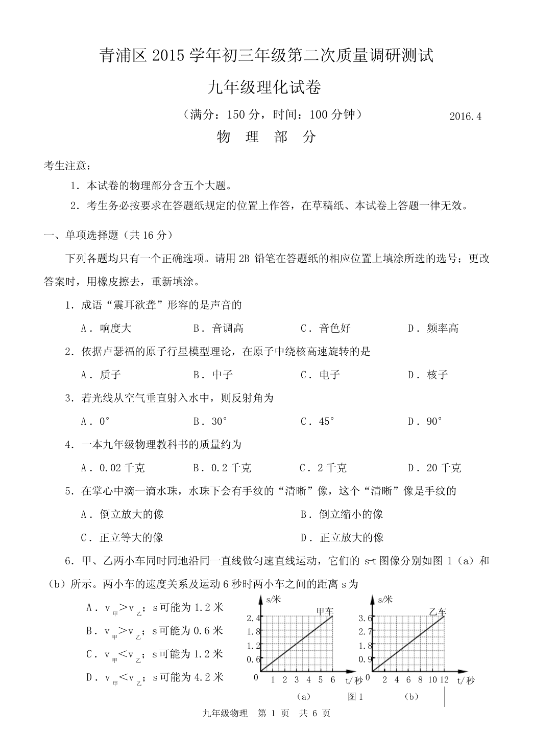 青浦区2015学年初三年级第二次质量调研测试九年级理化试卷(满分:150分,时间:100分钟)2016.4物理部分考生注意:1.本试卷的物理部分含五个大题。2.考生务必按要求在答题纸规定的位置上作答,在草稿纸、本试卷上答题一律无效。一、单项选择题(共16分)下列各题均只有一个正确选项。请用2B铅笔在答题纸的相应位置上填涂所选的选号;更改答案时,用橡皮擦去,重新填涂。1.成语“震耳欲聋”形容的是声音的A.响度大B.音调高C.音色好D.频率高2.依据卢瑟福的原子行星模型理论,在原子中绕核高速旋转的是A.质子B