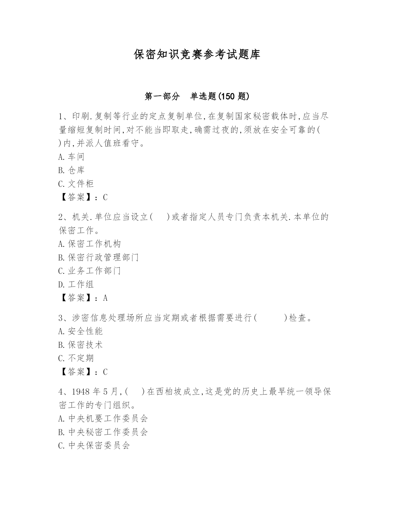 保密知识竞赛参考试题库第一部分单选题(150题)1、()年,党中央发出《关于恢复和健全保密委员会的通知》,中央保密委员会及其办事机构恢复并开始工作。A.1976B.1977C.1978D.1979【答案】:C2、保密期限的()、知悉范围的(),三者即可以单独变更,也可以同时变更。A.降低缩小缩小B.降低或提高缩短或延长缩小或扩大C.提高延长扩大D.降低缩短或延长缩小【答案】:B3、商业秘密是指不为公众所知悉,能为权利人带来(),具有实用性并经权利人采取保密措施的()。A.社会效益技术信息B.经济效益经营信