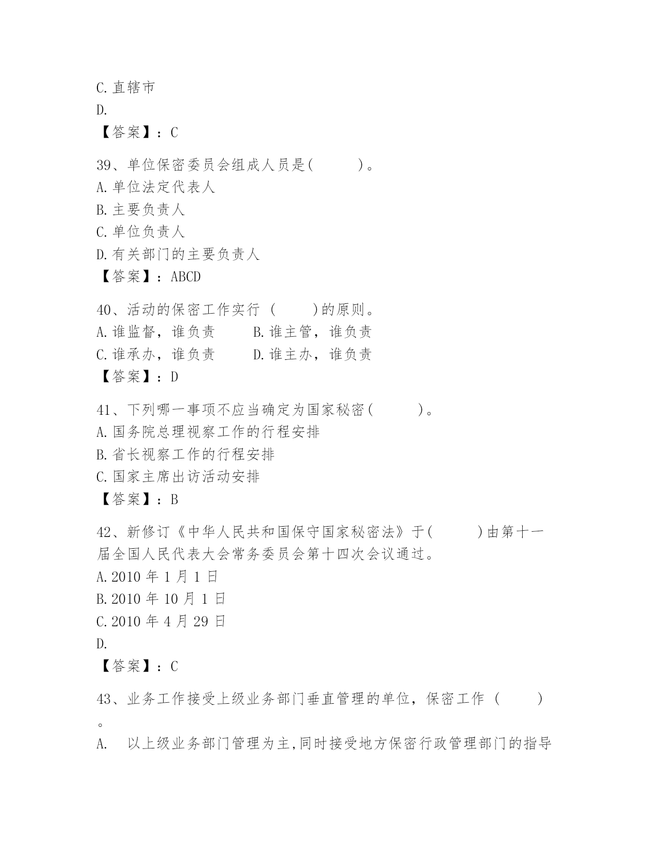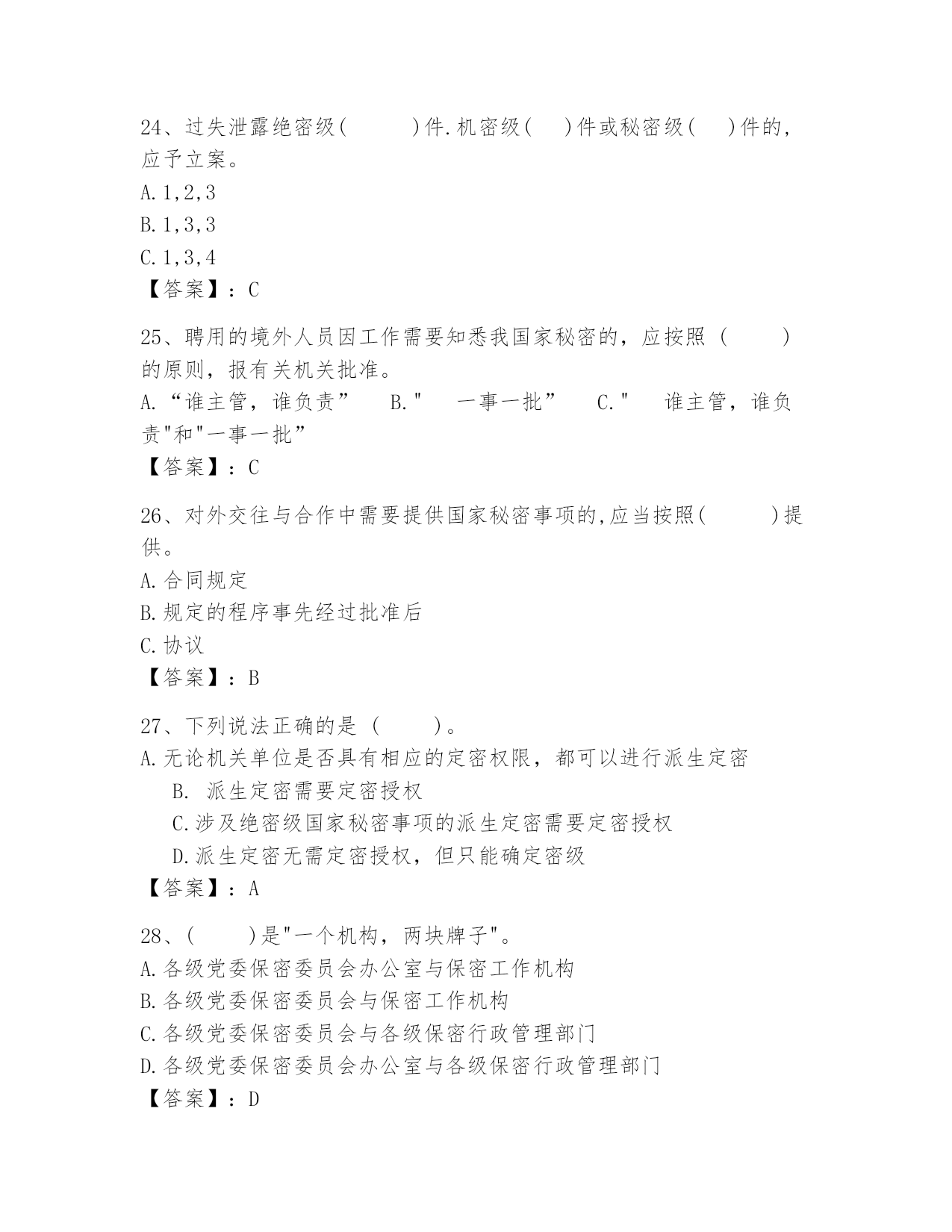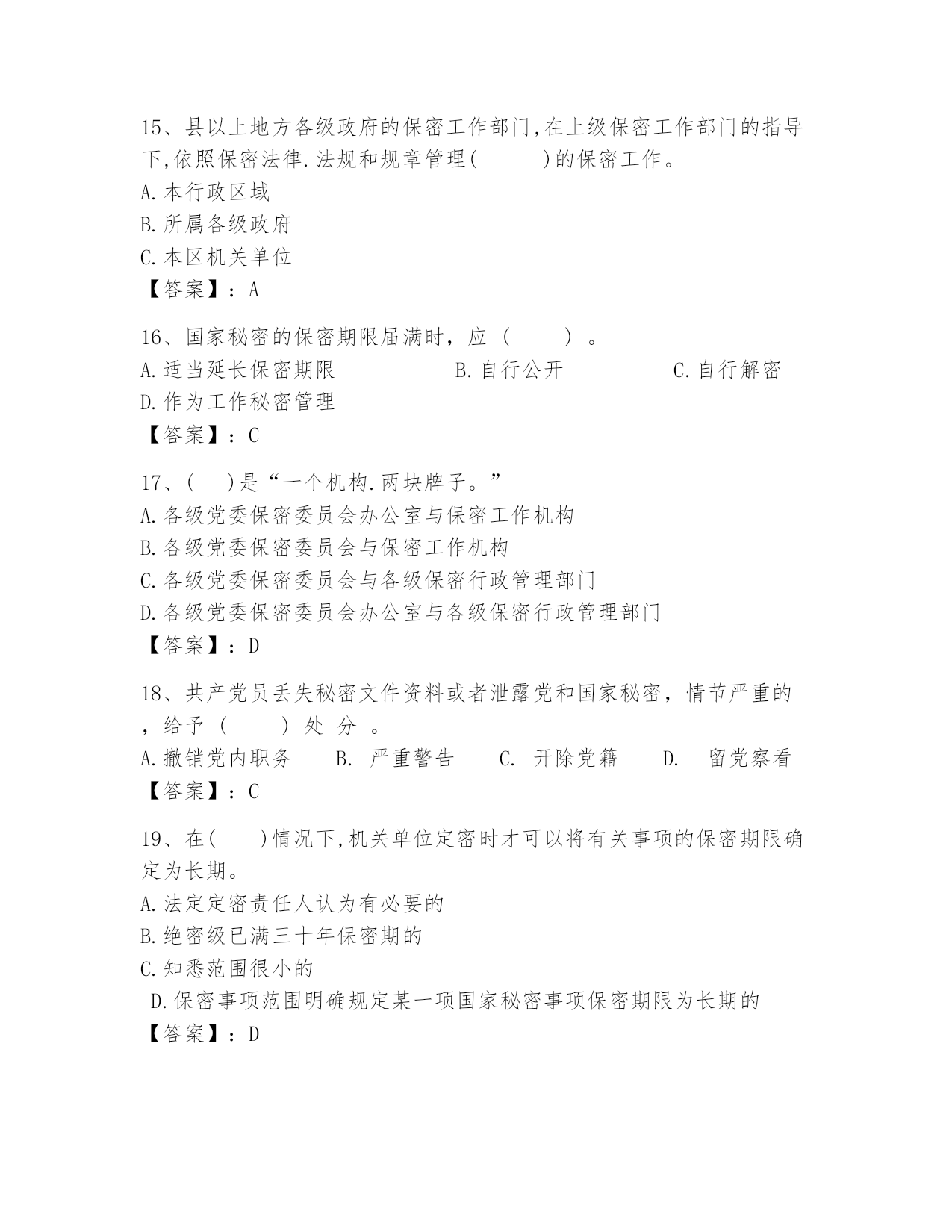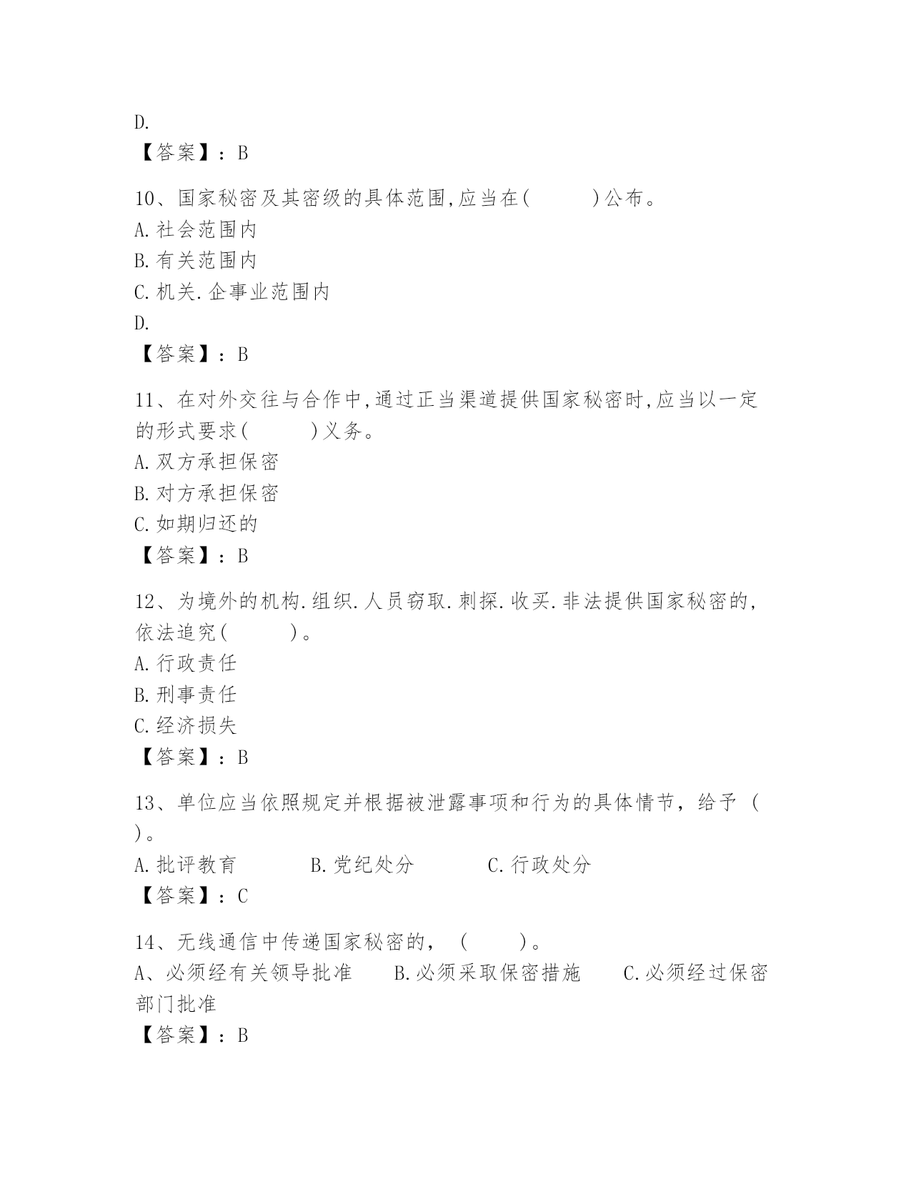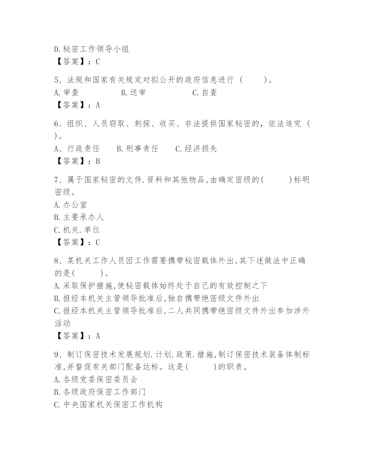 保密知识竞赛参考试题库第一部分单选题(150题)1、保密期限的()、知悉范围的(),三者即可以单独变更,也可以同时变更。A.降低缩小缩小B.降低或提高缩短或延长缩小或扩大C.提高延长扩大D.降低缩短或延长缩小【答案】:B2、各单位保密工作机构应对计算机信息系统的工作人员进行()的保密培训,并定期进行保密教育和检查。A.工作中B.定期C.上岗前【答案】:C3、某机关工作人员因工作需要携带秘密载体外出,其下述做法中正确的是()。A.采取保护措施,使秘密载体始终处于自己的有效控制之下B.报经本机关主管领导批准后