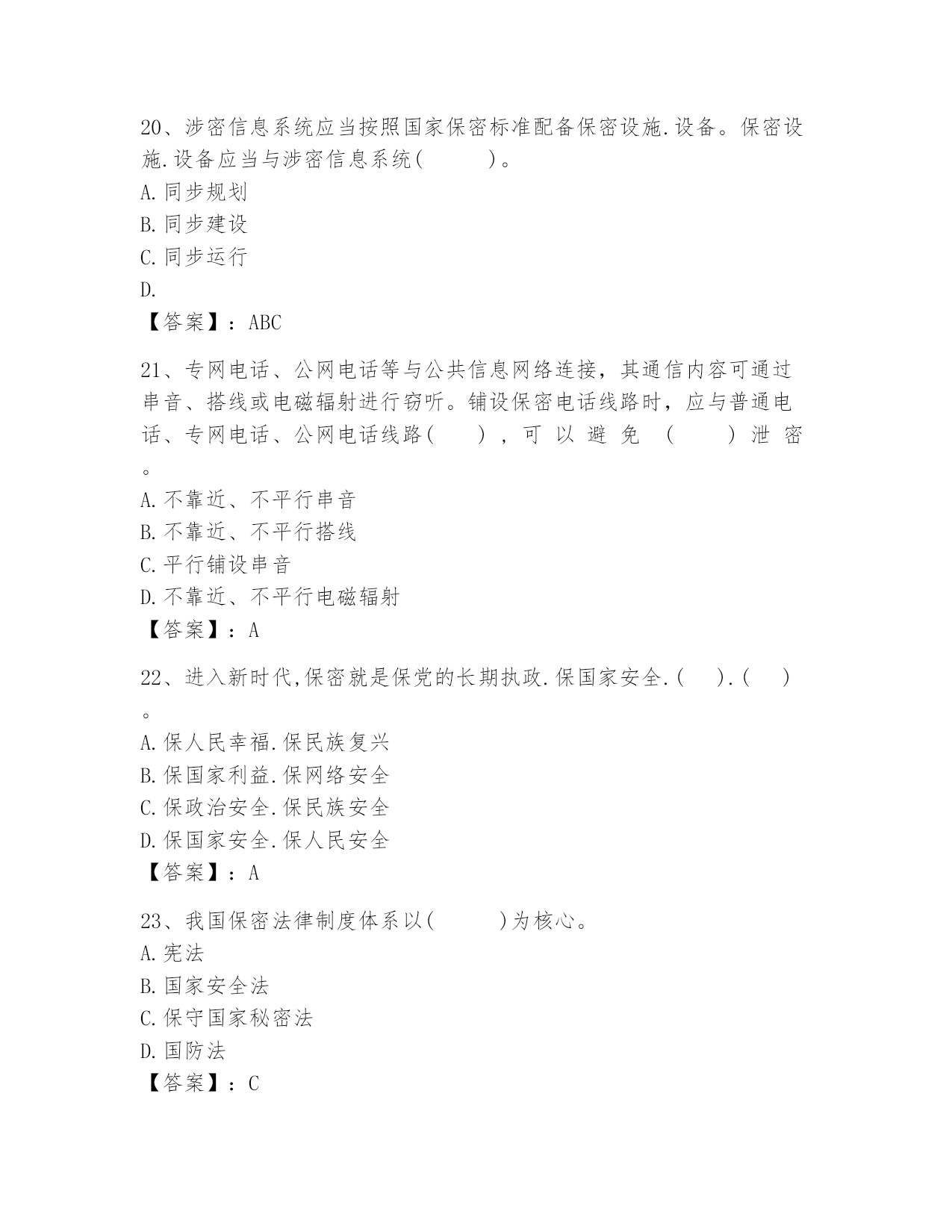 保密知识竞赛参考试题库第一部分单选题(150题)1、涉密信息处理场所应当定期或者根据需要进行()检查。A.安全性能B.保密技术C.不定期【答案】:C2、国家秘密是关系国家安全和利益,依照()确定,在一定时间内只限一定范围的人员知悉的事项。A.工作需要B.个人意愿C.法定程序D.上级指示【答案】:C3、1949年初,中共中央迁至北平办公,选择香山作为中共中央驻地,为了保密,对外将驻地称为()。A.工农兵大学B.中央大学C.农业大学D.劳动大学【答案】:D4、国家统一考试保密管理工作由()负责。A.教育部B.