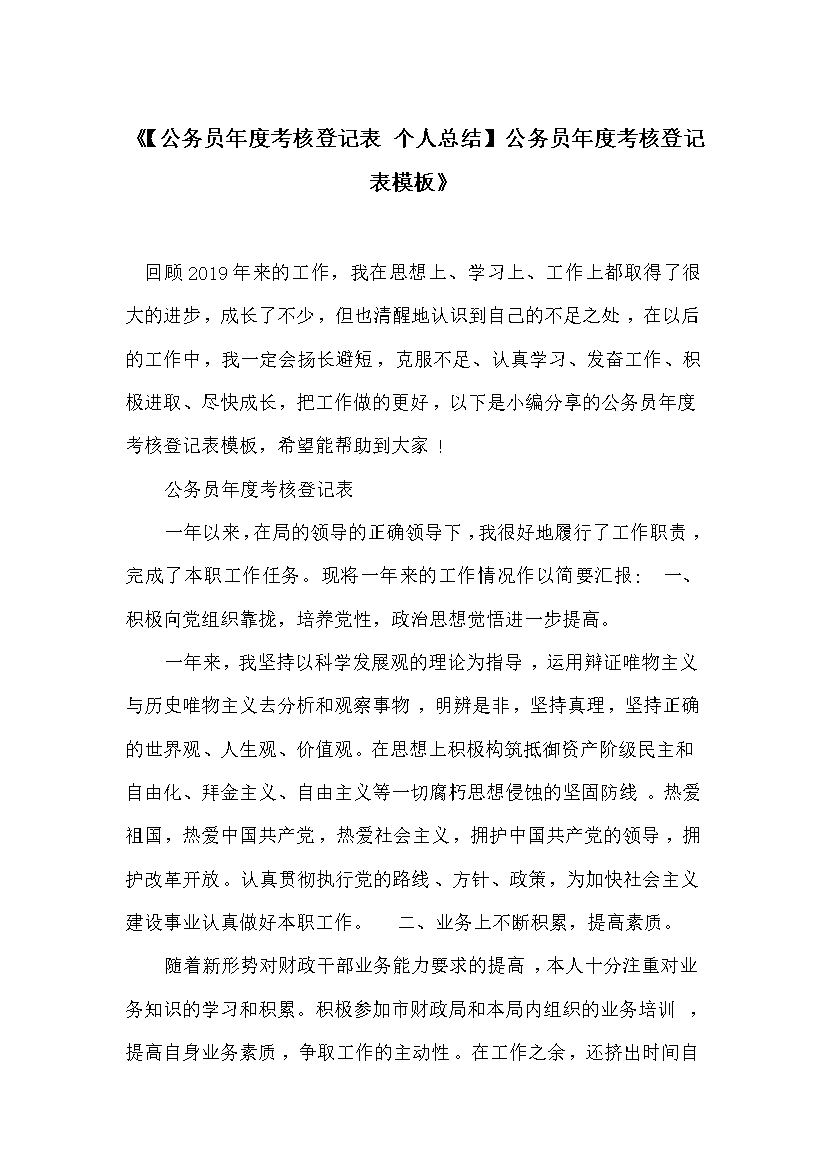 《【公务员年度考核登记表个人总结】公务员年度考核登记表模板》回顾2019年来的工作我在思想上、学习上、工作上都取得了很大的进步成长了不少但也清醒地认识到自己的不足之处在以后的工作中我一定会扬长避短克服不足、认真学习、发奋工作、积极进取、尽快成长把工作做的更好以下是小编分享的公务员年度考核登记表模板希望能帮助到大家!公务员年度考核登记表一年以来在局的领导的正确领导下我很好地履行了工作职责完成了本职工作任务。现将一年来的工作情况作以简要汇报:一、积极向党组织靠拢培养党性政治思想觉悟进一步提高。一年来