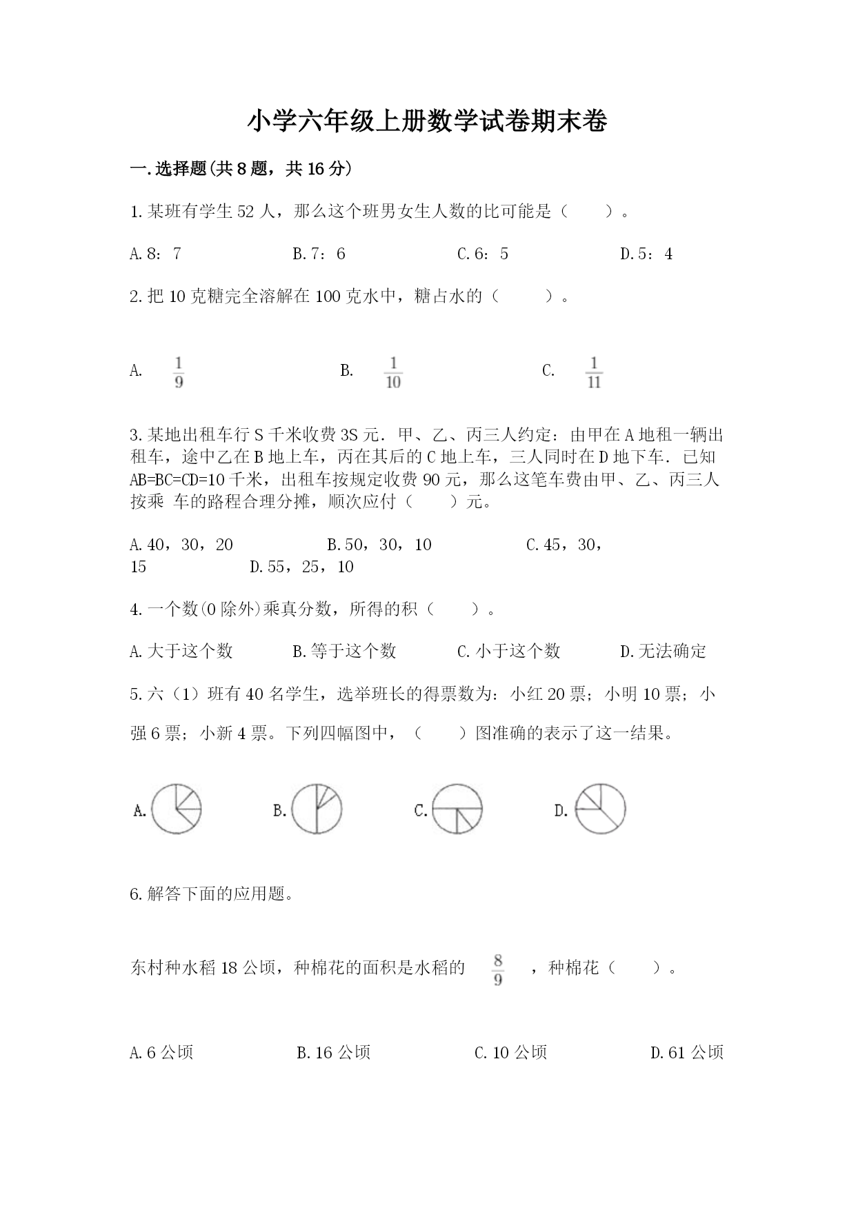 小学六年级上册数学试卷期末卷一.选择题(共8题,共16分)1.某班有学生52人,那么这个班男女生人数的比可能是()。A.8:7B.7:6C.6:5D.5:42.把10克糖完全溶解在100克水中,糖占水的()。A.B.C.3.某地出租车行S千米收费3S元.甲、乙、丙三人约定:由甲在A地租一辆出租车,途中乙在B地上车,丙在其后的C地上车,三人同时在D地下车.已知AB=BC=CD=10千米,出租车按规定收费90元,那么这笔车费由甲、乙、丙三人按乘车的路程合理分摊,顺次应付()元。A.40,30,20B.50,3