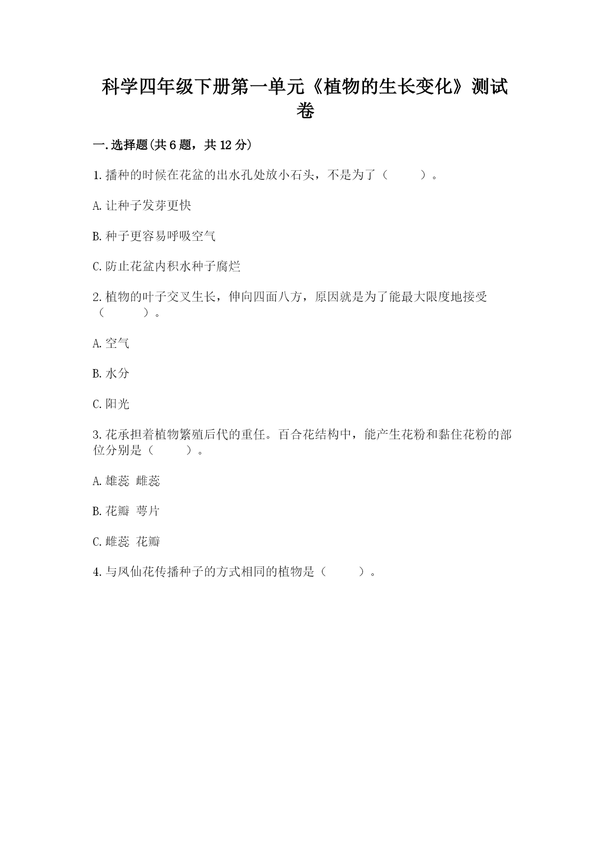 科学四年级下册第一单元《植物的生长变化》测试卷一.选择题(共6题,共12分)1.播种的时候在花盆的出水孔处放小石头,不是为了()。A.让种子发芽更快B.种子更容易呼吸空气C.防止花盆内积水种子腐烂2.植物的叶子交叉生长,伸向四面八方,原因就是为了能最大限度地接受()。A.空气B.水分C.阳光3.花承担着植物繁殖后代的重任。百合花结构中,能产生花粉和黏住花粉的部位分别是()。A.雄蕊雌蕊B.花瓣萼片C.雌蕊花瓣4.与凤仙花传播种子的方式相同的植物是()。A.B.C.5.下面植物的种子主要依靠动物传播的是()