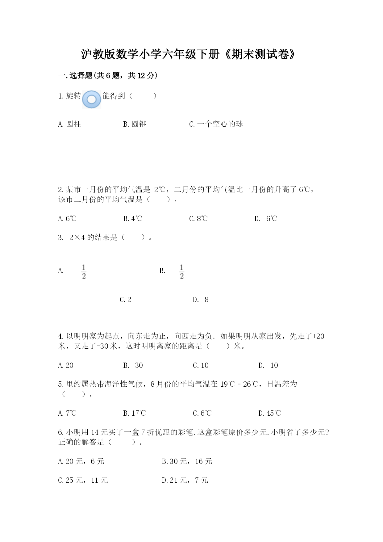 沪教版数学小学六年级下册《期末测试卷》一.选择题(共6题,共12分)1.旋转能得到()A.圆柱B.圆锥C.一个空心的球2.某市一月份的平均气温是-2℃,二月份的平均气温比一月份的升高了6℃,该市二月份的平均气温是()。A.6℃B.4℃C.8℃D.-6℃3.-2×4的结果是()。A.-B.C.2D.-84.以明明家为起点,向东走为正,向西走为负.如果明明从家出发,先走了+20米,又走了-30米,这时明明离家的距离是()米。A.20B.-30C.10D.-105.里约属热带海洋性气候,8月份的平均气温在19℃