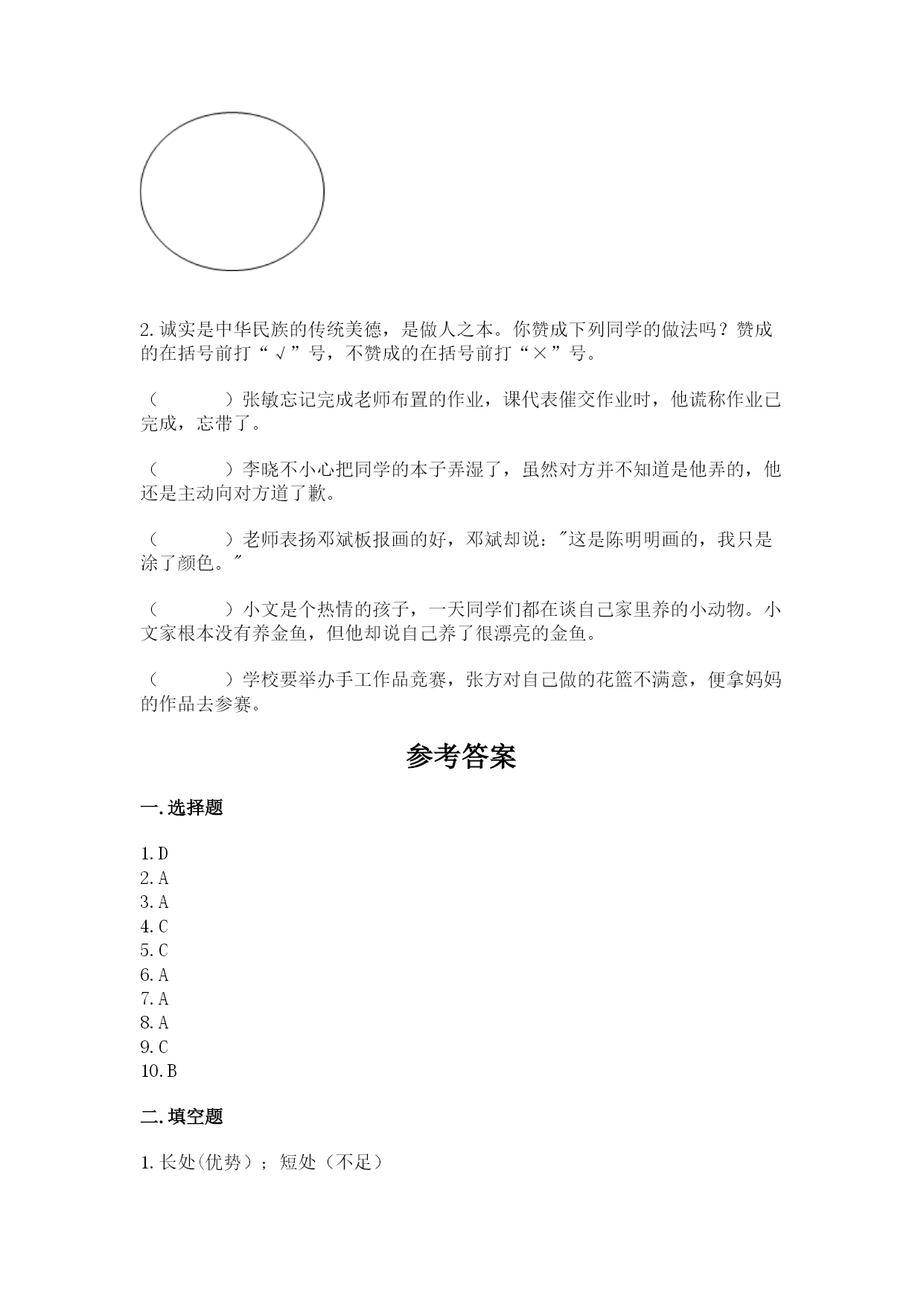 部编版三年级下册道德与法治期末测试卷一.选择题(共10题,共20分)1.下列说法正确的是()。A.我还小,说一次谎不会有什么严重的后果B.我的成长需要诚实的品质来陪伴,我应该成为一个诚实守信的人C.我心里害怕时可以说谎2.帮助他人也要讲究方式方法,当小雨在图书架上取书拿不着时,()的说法较合适。A.我来试试,或许能帮到你B.嘿嘿,个子太矮了吧,我来帮你拿C.你看你那费劲的样子,真是太急人了,我来帮你拿3.根据《中华人民共和国治安管理处罚法》的相关规定,盗窃、损毁路面井盖、照明等公共设施,处()。A.五日以