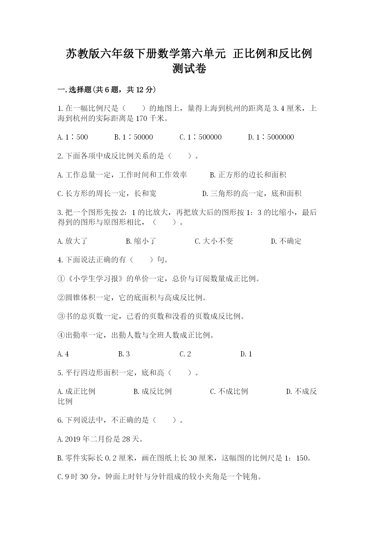苏教版六年级下册数学第六单元正比例和反比例测试卷一.选择题(共6题,共12分)1.在一幅比例尺是()的地图上,量得上海到杭州的距离是3.4厘米,上海到杭州的实际距离是170千米。A.1∶500B.1∶50000C.1∶500000D.1∶50000002.下面各项中成反比例关系的是()。A.工作总量一定,工作时间和工作效率B.正方形的边长和面积C.长方形的周长一定,长和宽D.三角形的高一定,底和面积3.把一个图形先按2:1的比放大,再把放大后的图形按1:3的比缩小,最后得到的图形与原图形相比,()。A.放
