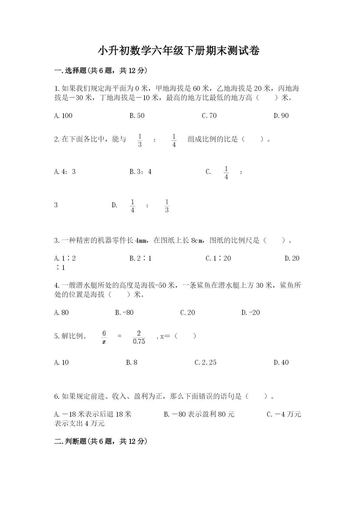 小升初数学六年级下册期末测试卷一.选择题(共6题,共12分)1.如果我们规定海平面为0米,甲地海拔是60米,乙地海拔是20米,丙地海拔是-30米,丁地海拔是-10米,最高的地方比最低的地方高()米。A.100B.50C.70D.902.在下面各比中,能与:组成比例的比是()。A.4:3B.3:4C.:3D.:3.一种精密的机器零件长4mm,在图纸上长8cm,图纸的比例尺是()。A.1∶2B.2∶1C.1∶20D.20∶14.一艘潜水艇所处的高度是海拔-50米,一条鲨鱼在潜水艇上方30米,鲨鱼所处的位置是海