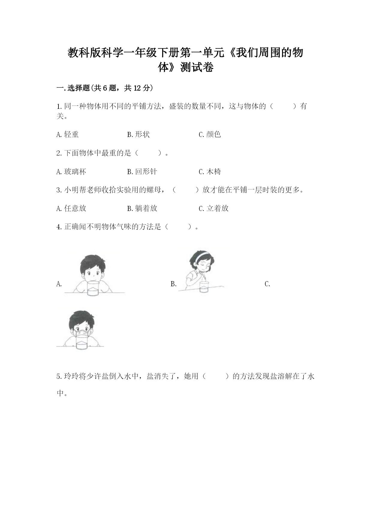 教科版科学一年级下册第一单元《我们周围的物体》测试卷一.选择题(共6题,共12分)1.同一种物体用不同的平铺方法,盛装的数量不同,这与物体的()有关。A.轻重B.形状C.颜色2.下面物体中最重的是()。A.玻璃杯B.回形针C.木椅3.小明帮老师收拾实验用的螺母,()放才能在平铺一层时装的更多。A.任意放B.躺着放C.立着放4.正确闻不明物体气味的方法是()。A.B.C.5.玲玲将少许盐倒入水中,盐消失了,她用()的方法发现盐溶解在了水中。A.搅拌B.观察C.品尝6.只有()是有气味的。A.水B.小木块C.
