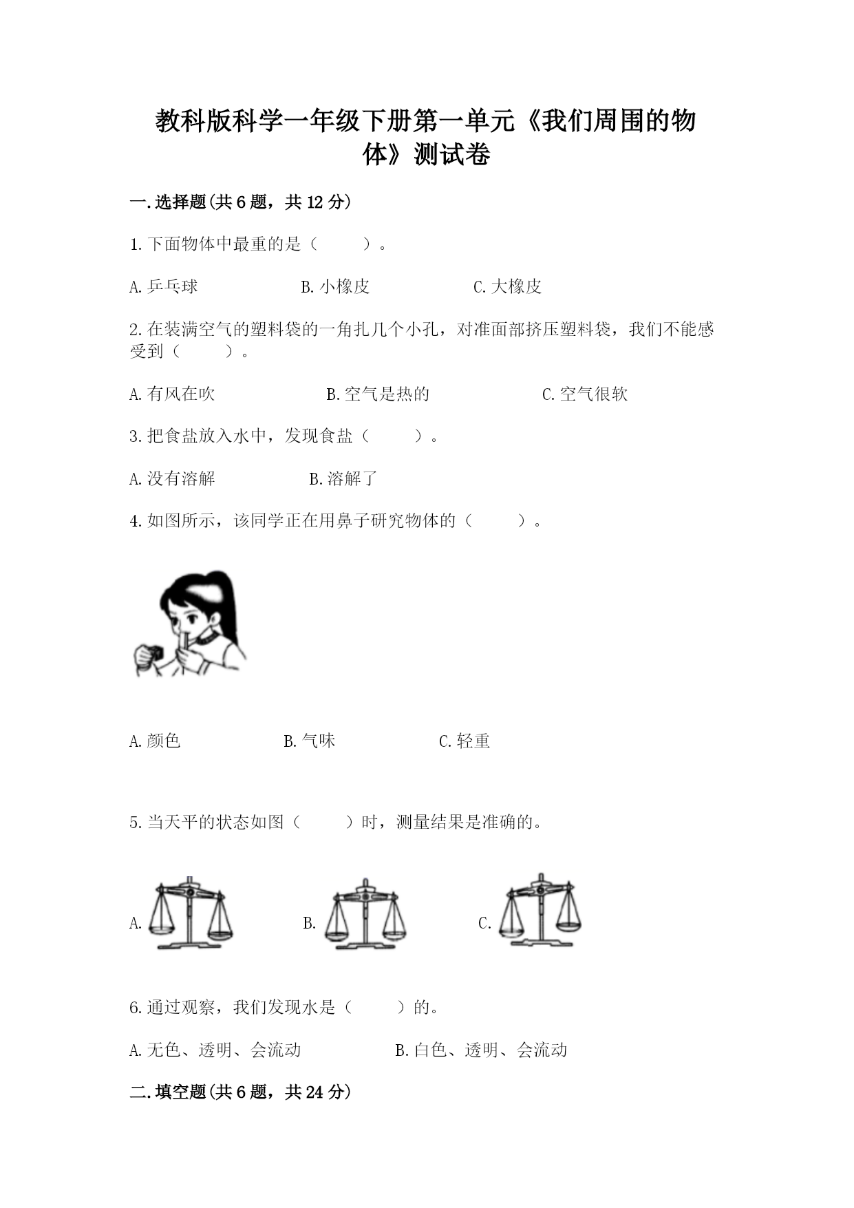 教科版科学一年级下册第一单元《我们周围的物体》测试卷一.选择题(共6题,共12分)1.下面物体中最重的是()。A.乒乓球B.小橡皮C.大橡皮2.在装满空气的塑料袋的一角扎几个小孔,对准面部挤压塑料袋,我们不能感受到()。A.有风在吹B.空气是热的C.空气很软3.把食盐放入水中,发现食盐()。A.没有溶解B.溶解了4.如图所示,该同学正在用鼻子研究物体的()。A.颜色B.气味C.轻重5.当天平的状态如图()时,测量结果是准确的。A.B.C.6.通过观察,我们发现水是()的。A.无色、透明、会流动B.白色、透