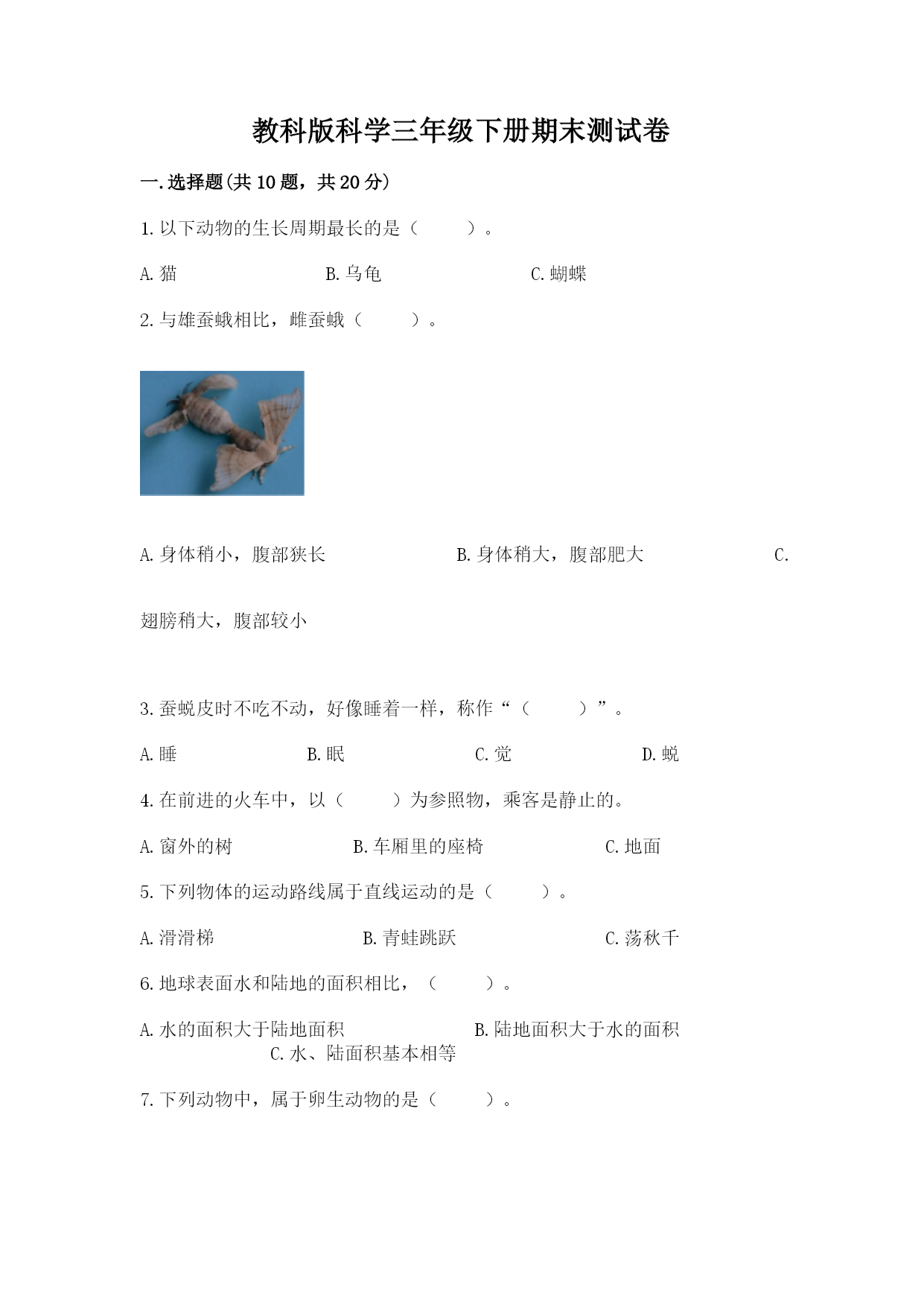 教科版科学三年级下册期末测试卷一.选择题(共10题,共20分)1.以下动物的生长周期最长的是()。A.猫B.乌龟C.蝴蝶2.与雄蚕蛾相比,雌蚕蛾()。A.身体稍小,腹部狭长B.身体稍大,腹部肥大C.翅膀稍大,腹部较小3.蚕蜕皮时不吃不动,好像睡着一样,称作“()”。A.睡B.眠C.觉D.蜕4.在前进的火车中,以()为参照物,乘客是静止的。A.窗外的树B.车厢里的座椅C.地面5.下列物体的运动路线属于直线运动的是()。A.滑滑梯B.青蛙跳跃C.荡秋千6.地球表面水和陆地的面积相比,()。A.水的面积大于陆地