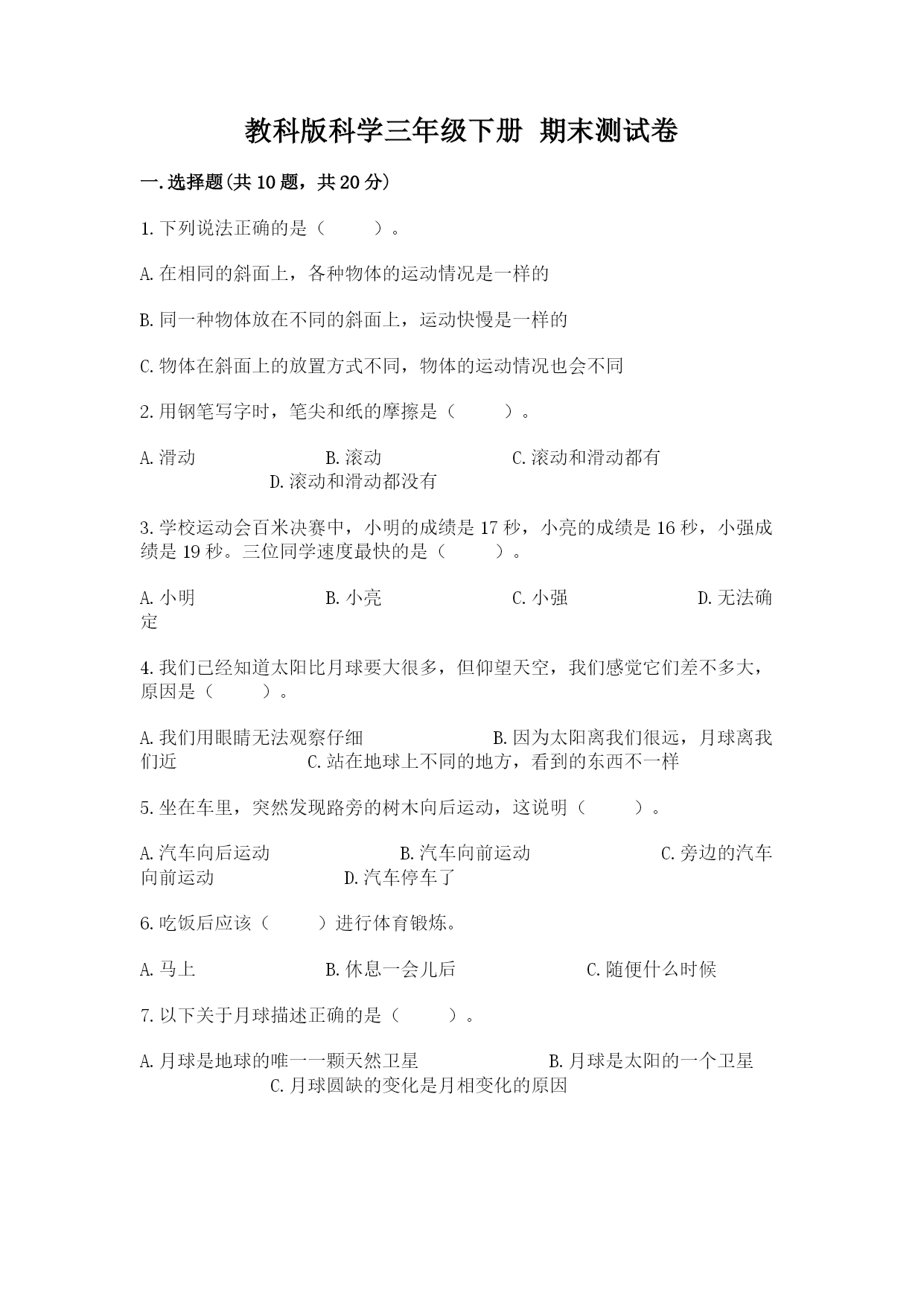 教科版科学三年级下册期末测试卷一.选择题(共10题,共20分)1.下列说法正确的是()。A.在相同的斜面上,各种物体的运动情况是一样的B.同一种物体放在不同的斜面上,运动快慢是一样的C.物体在斜面上的放置方式不同,物体的运动情况也会不同2.用钢笔写字时,笔尖和纸的摩擦是()。A.滑动B.滚动C.滚动和滑动都有D.滚动和滑动都没有3.学校运动会百米决赛中,小明的成绩是17秒,小亮的成绩是16秒,小强成绩是19秒。三位同学速度最快的是()。A.小明B.小亮C.小强D.无法确定4.我们已经知道太阳比月球要大很多