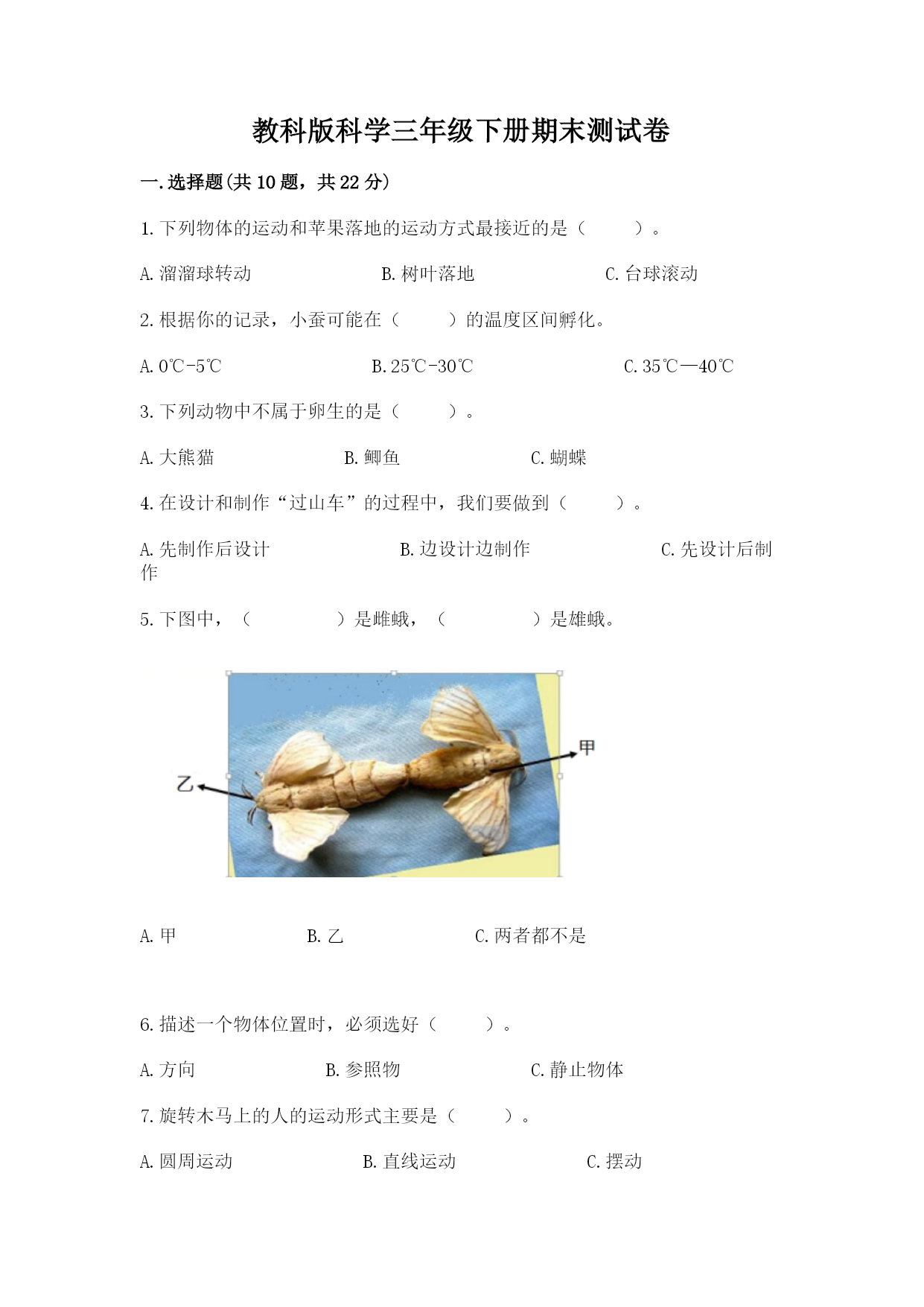 教科版科学三年级下册期末测试卷一.选择题(共10题,共22分)1.下列物体的运动和苹果落地的运动方式最接近的是()。A.溜溜球转动B.树叶落地C.台球滚动2.根据你的记录,小蚕可能在()的温度区间孵化。A.0℃-5℃B.25℃-30℃C.35℃—40℃3.下列动物中不属于卵生的是()。A.大熊猫B.鲫鱼C.蝴蝶4.在设计和制作“过山车”的过程中,我们要做到()。A.先制作后设计B.边设计边制作C.先设计后制作5.下图中,()是雌蛾,()是雄蛾。A.甲B.乙C.两者都不是6.描述一个物体位置时,必须选好()