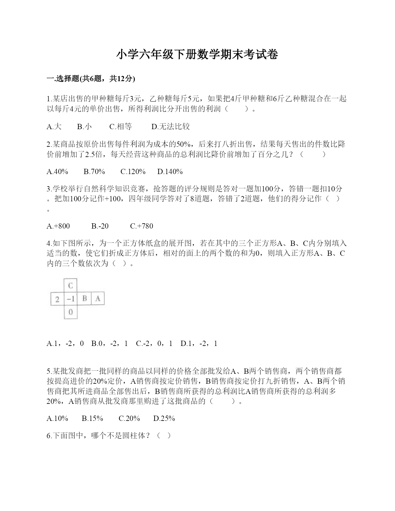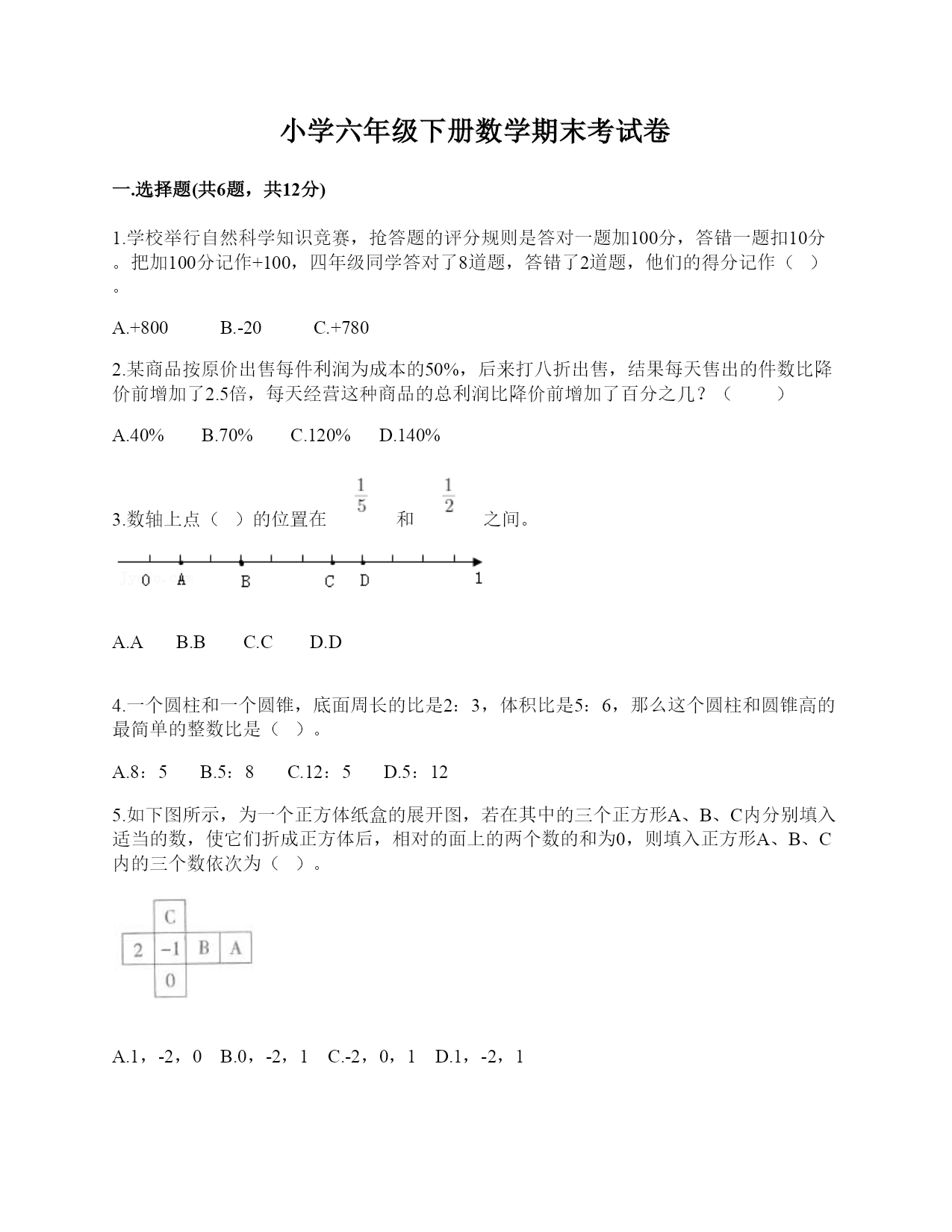 小学六年级下册数学期末考试卷一.选择题(共6题,共12分)1.数轴上点()的位置在和之间。A.AB.BC.CD.D2.如下图所示,为一个正方体纸盒的展开图,若在其中的三个正方形A、B、C内分别填入适当的数,使它们折成正方体后,相对的面上的两个数的和为0,则填入正方形A、B、C内的三个数依次为()。A.1,-2,0B.0,-2,1C.-2,0,1D.1,-2,13.图中的正方体、圆柱体和圆锥体的底面积相等,高也相等,下面说法正确的是()。A.圆锥的体积是圆柱体积的3倍B.圆柱的体积比正方体的体积小一些C.圆