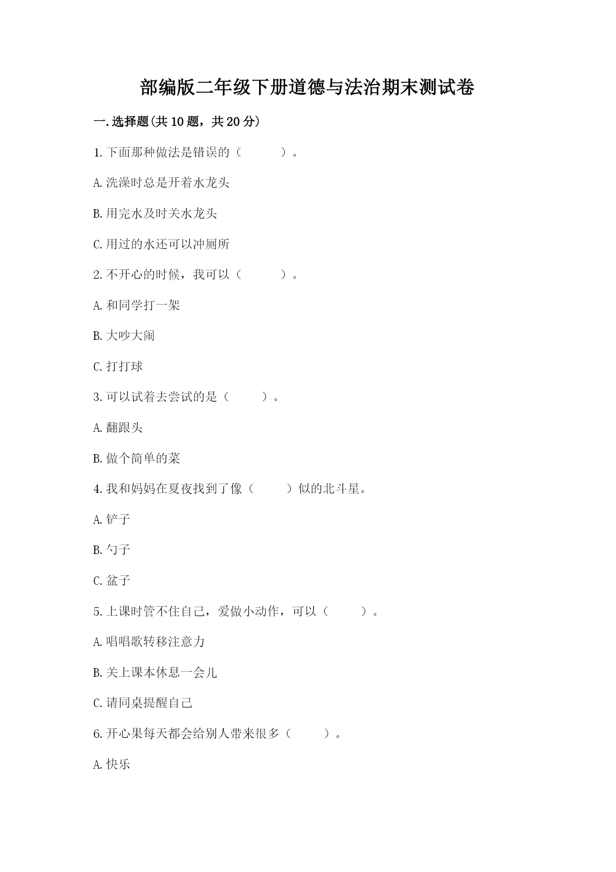 部编版二年级下册道德与法治期末测试卷一.选择题(共10题,共20分)1.下面那种做法是错误的()。A.洗澡时总是开着水龙头B.用完水及时关水龙头C.用过的水还可以冲厕所2.不开心的时候,我可以()。A.和同学打一架B.大吵大闹C.打打球3.可以试着去尝试的是()。A.翻跟头B.做个简单的菜4.我和妈妈在夏夜找到了像()似的北斗星。A.铲子B.勺子C.盆子5.上课时管不住自己,爱做小动作,可以()。A.唱唱歌转移注意力B.关上课本休息一会儿C.请同桌提醒自己6.开心果每天都会给别人带来很多()。A.快乐B.