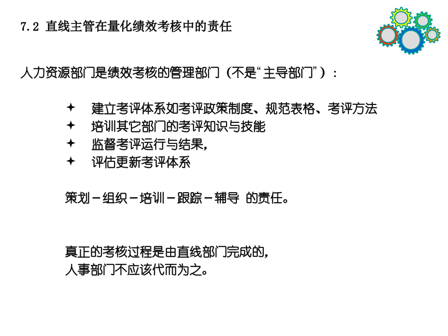 KPI量化绩效考核怎样为本企业策划出一个以KPI为核心的,适用的目标管理系统而且这个系统:1-包含绩效目标量化考核系统2-能够不断被升级优化。7.1传统考核与量化考核的对比KPI模式包括量化绩效目标,但不等于完全量化考核传统考核内容和特点:内容工作的质和量工作态度和行为工作能力和表现工作纪律和作风特点:定性为主注重和别人比较打分或分等级凭主管的主观感觉通过增加评分人来平衡量化考核内容和特点:内容工作的结果包括效率、质、量、成本特点:量化的考核目标注重结果和目标的比较打分或分等级通过增加目标来平衡传统考核填