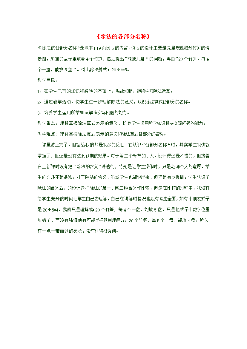 素材-全国-2020_二年级数学下册《除法的各部分名称》教学反思 新人教版.doc