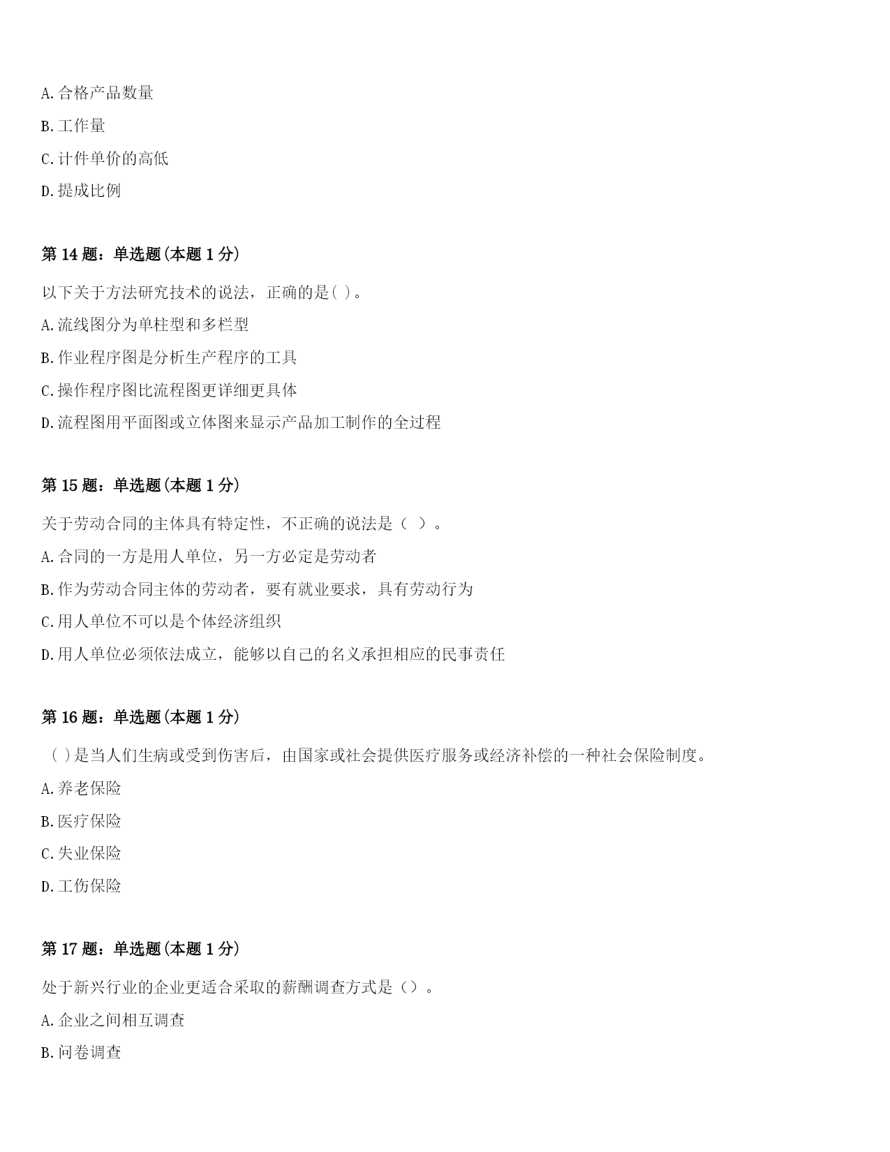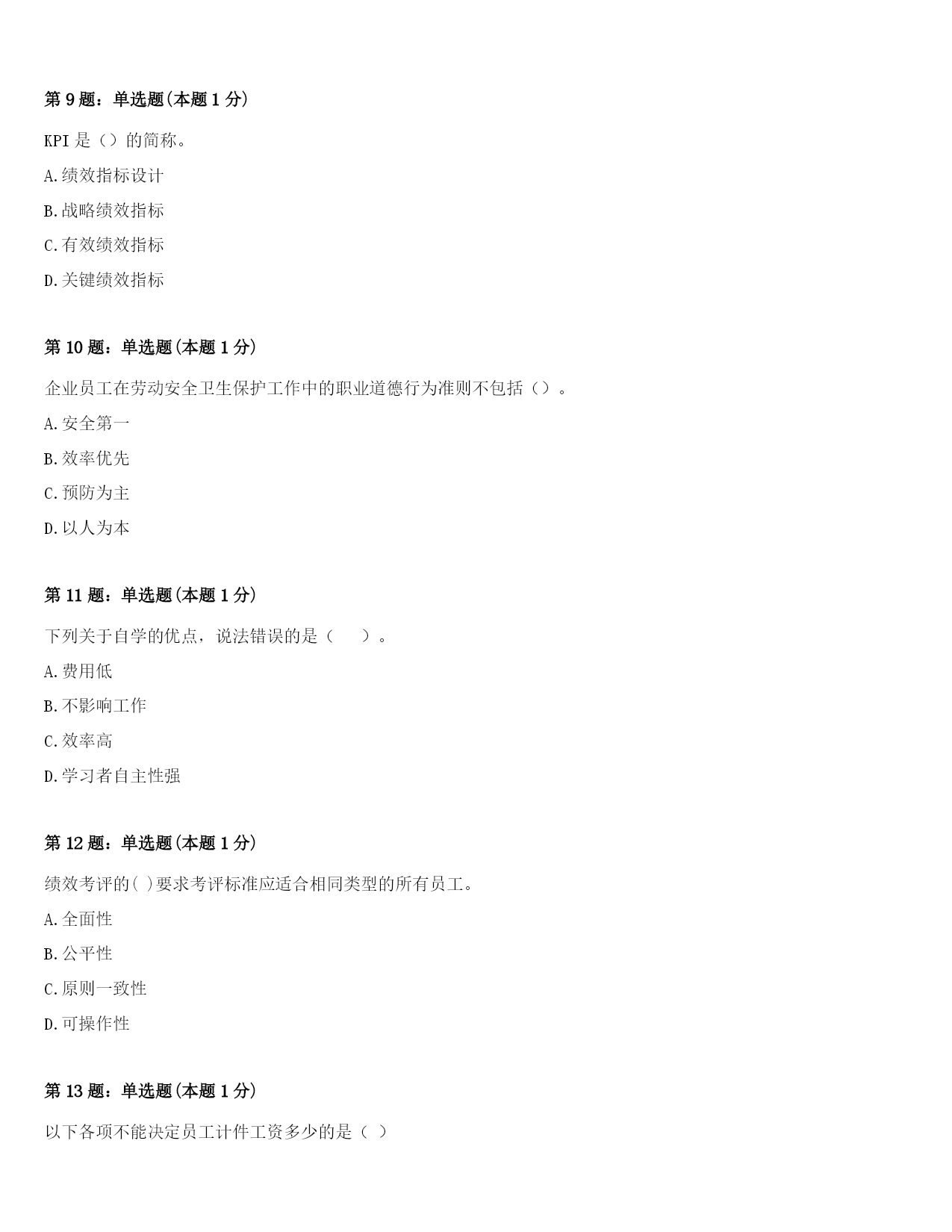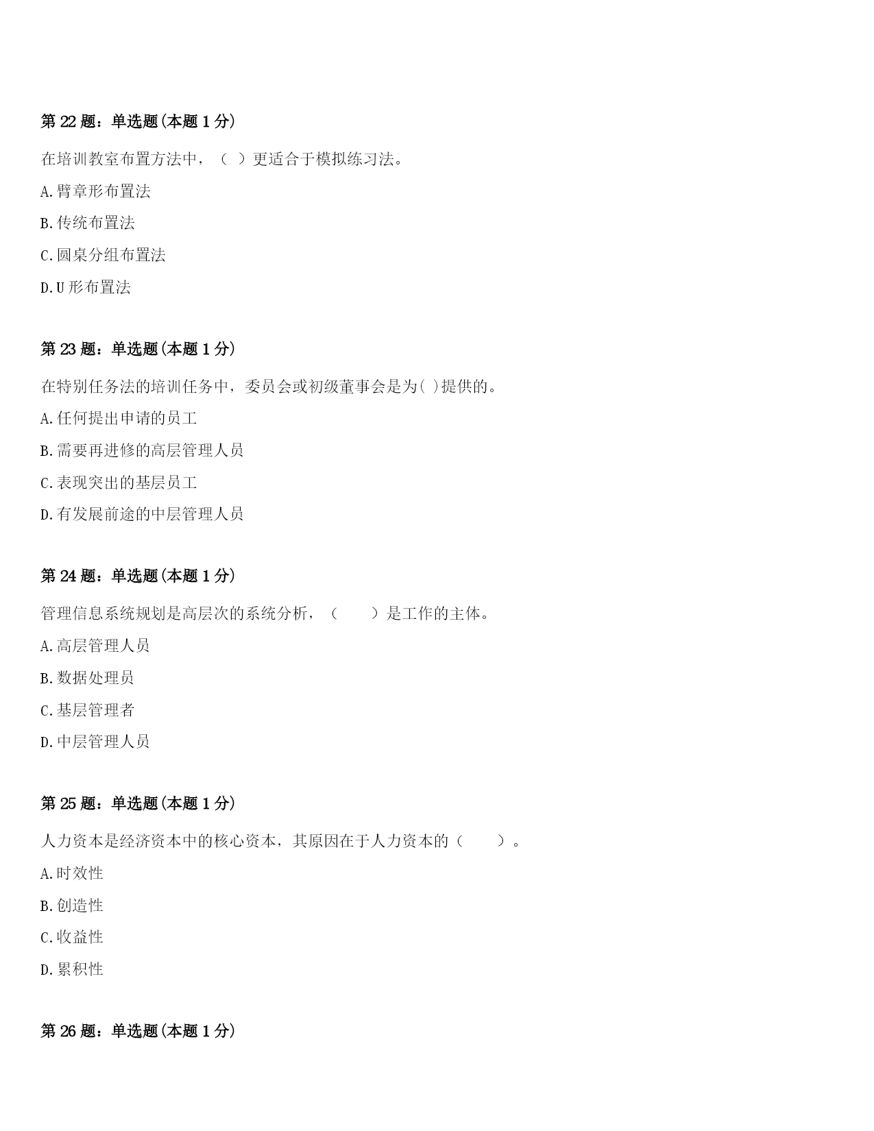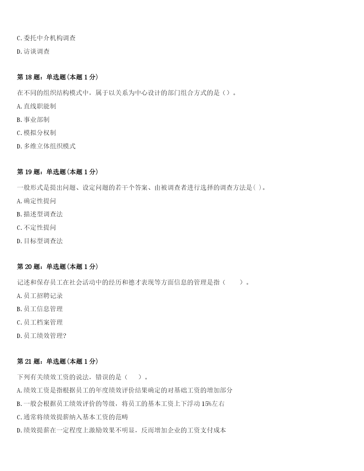 2024年青海省海东地区平安县四级人力资源管理师《理论知识》巅峰冲刺试卷及答案第1题:单选题(本题1分)在特别任务法的培训任务中,委员会或初级董事会是为()提供的。A.任何提出申请的员工B.需要再进修的高层管理人员C.表现突出的基层员工D.有发展前途的中层管理人员第2题:单选题(本题1分)雇前背景调查涉及到很多方面,()不是背景调查的主要调查项目。A、学历调查B、个人资质调查C、目前工资及其他福利调查D、个人资信调查第3题:单选题(本题1分)()是指员工对工作所抱有的一般性的满足与否的态度。A.薪酬满意度