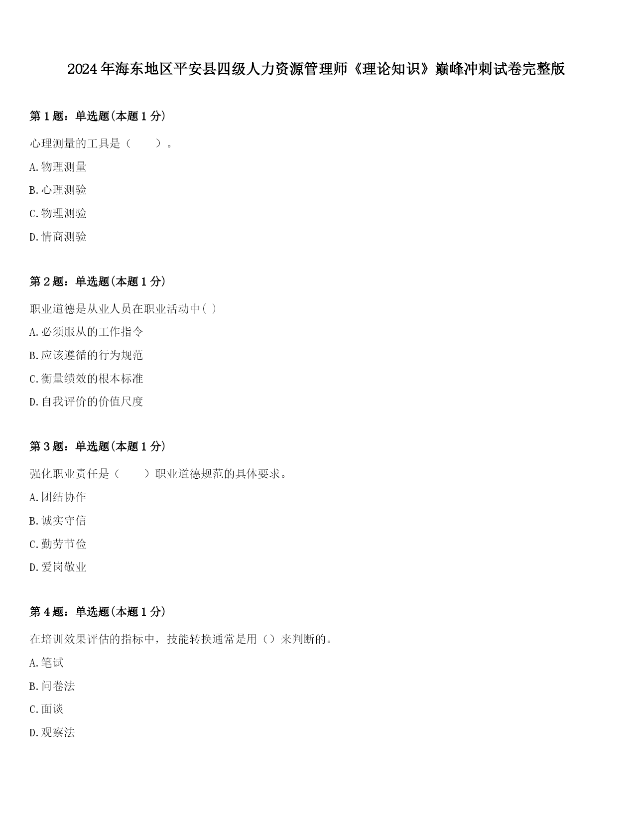 2024年海东地区平安县四级人力资源管理师《理论知识》巅峰冲刺试卷完整版第1题:单选题(本题1分)心理测量的工具是()。A.物理测量B.心理测验C.物理测验D.情商测验第2题:单选题(本题1分)职业道德是从业人员在职业活动中()A.必须服从的工作指令B.应该遵循的行为规范C.衡量绩效的根本标准D.自我评价的价值尺度第3题:单选题(本题1分)强化职业责任是()职业道德规范的具体要求。A.团结协作B.诚实守信C.勤劳节俭D.爱岗敬业第4题:单选题(本题1分)在培训效果评估的指标中,技能转换通常是用()来判断的