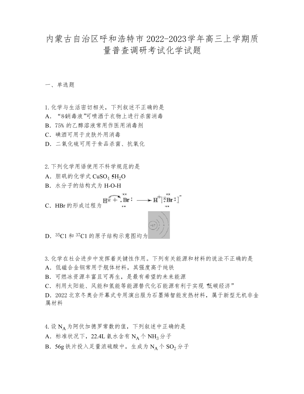 内蒙古自治区呼和浩特市2022-2023学年高三上学期质量普查调研考试化学试题一、单选题1.化学与生活密切相关,下列叙述不正确的是A.“84消毒液”可喷洒于衣物上进行杀菌消毒B.75%的乙醇溶液常用作医用消毒剂C.碘酒可用于皮肤外用消毒D.二氧化硫可用于食品杀菌、抗氧化2.下列化学用语使用不科学规范的是A.胆矾的化学式CuSO4·5H2OB.水分子的结构式为H-O-HC.HBr的形成过程为D.35C1和37C1的原子结构示意图均为3.化学在社会进步中发挥着关键性作用。下列有关能源和材料的说法不正确的是A.