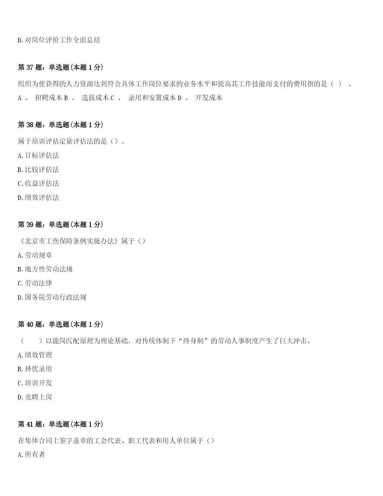 2024年甘肃省庆阳市环县四级人力资源管理师《理论知识》深度预测试题完整版第1题:单选题(本题1分)()是组织报酬体系和实施的第一原则。A.适当激励B.公平公正C.效率优先D.成本节约第2题:单选题(本题1分)企业鉴别简历的过程不包括()A.健康的体魄B.简历分析的预测效度C.简历项目的选择以及评定权重设计的准确性和客观性D.简历填写的真实性第3题:单选题(本题1分)笔试的缺点是不能全面考察应聘者的()A.财务知识B.观察能力C.管理知识D.管理能力第4题:单选题(本题1分)岗位写实是按照时间消耗的顺序,