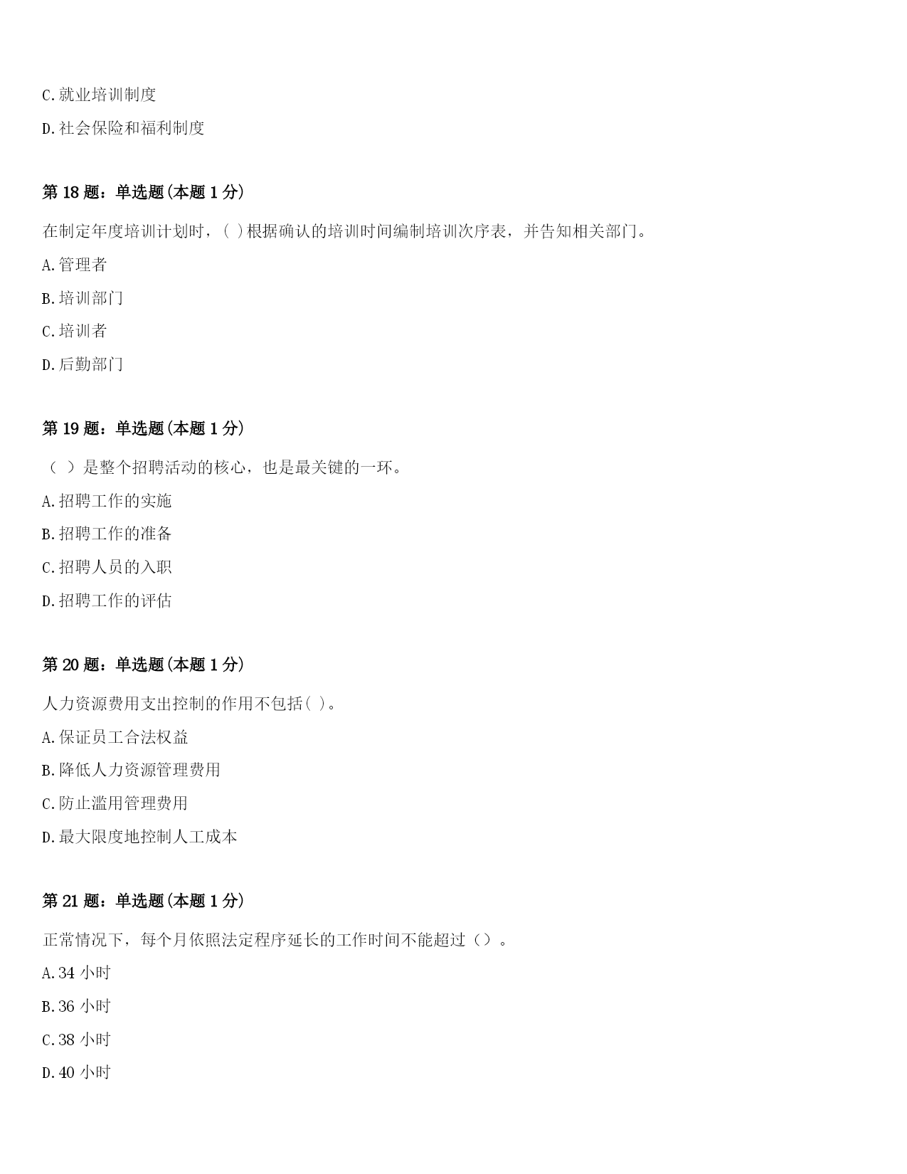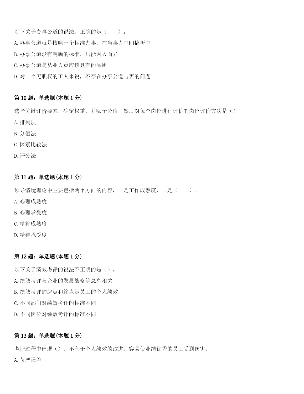 2024年矿区四级人力资源管理师《理论知识》高分冲刺试题完整版第1题:单选题(本题1分)关于现代企业有效的培训系统,说法不正确的是()A.最终能够有效地改善企业的经营业绩B.能促进员工现在和未来工作绩效的提高C.目的是在企业中最大限度地实现才尽其用D.应积极通过学习训练等手段提高员工的工作能力第2题:单选题(本题1分)日历时间包括()。A.制度工作时间和出勤时间B.非生产时间和制度工作时间C.制度公休时间和出勤时间D.制度工作时间和制度公休时间第3题:单选题(本题1分)()鼓励应聘者从不同角度思考问题。A