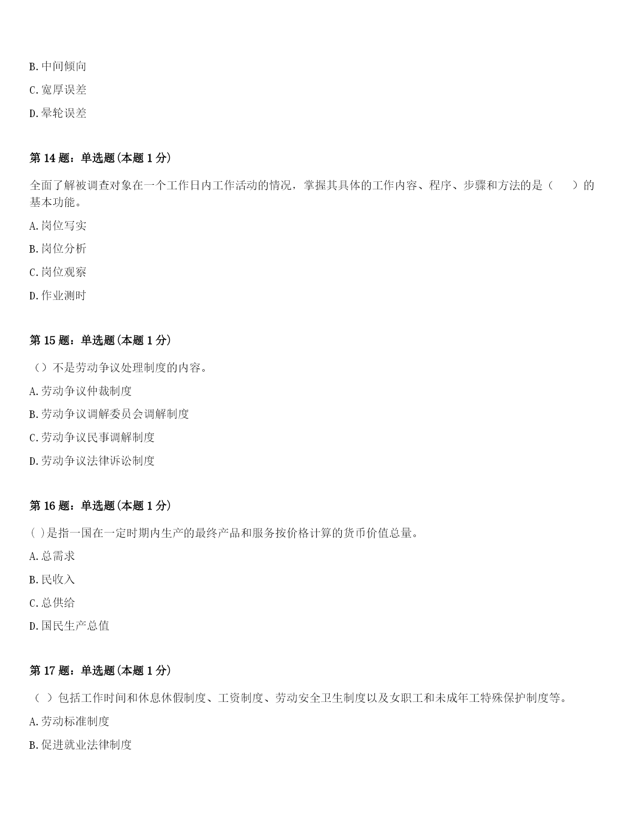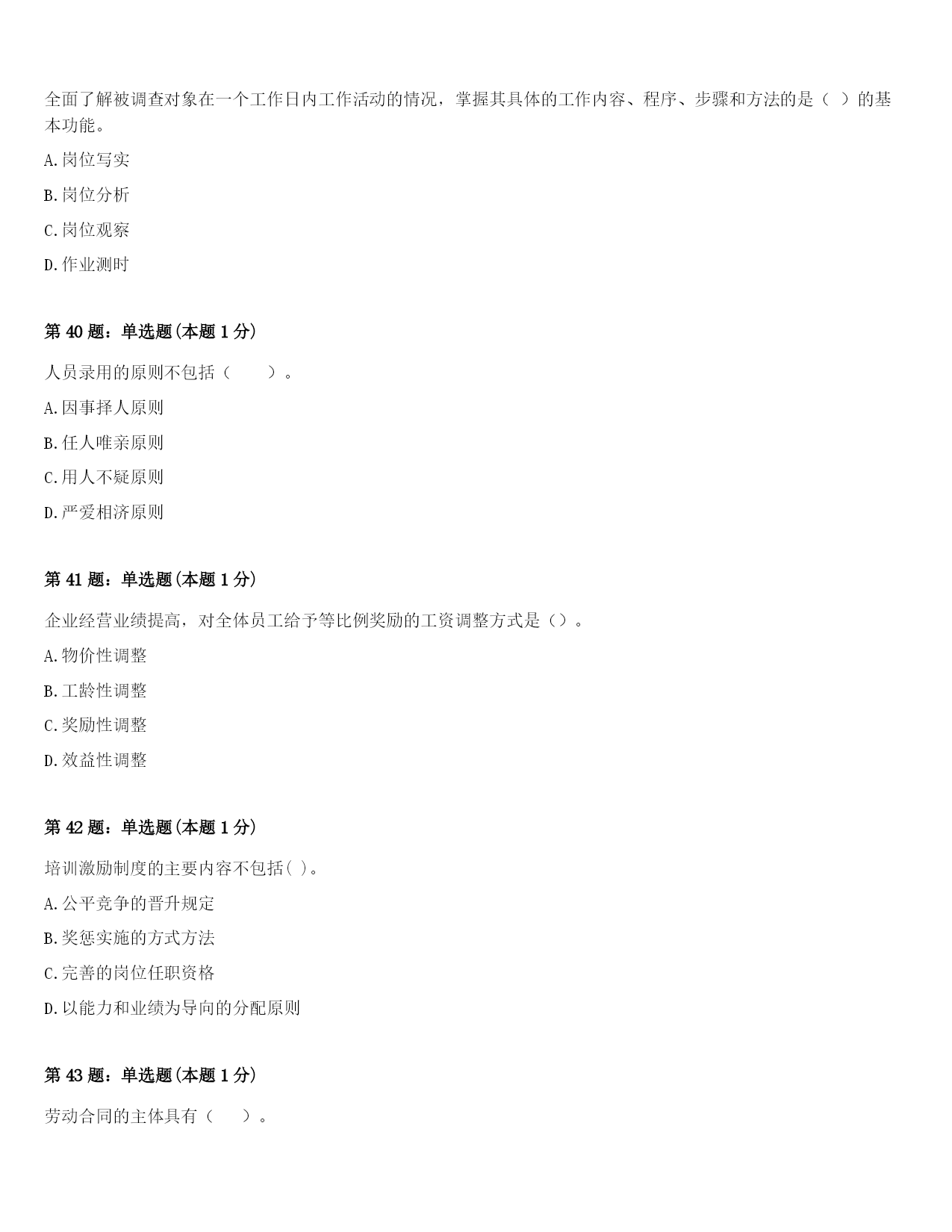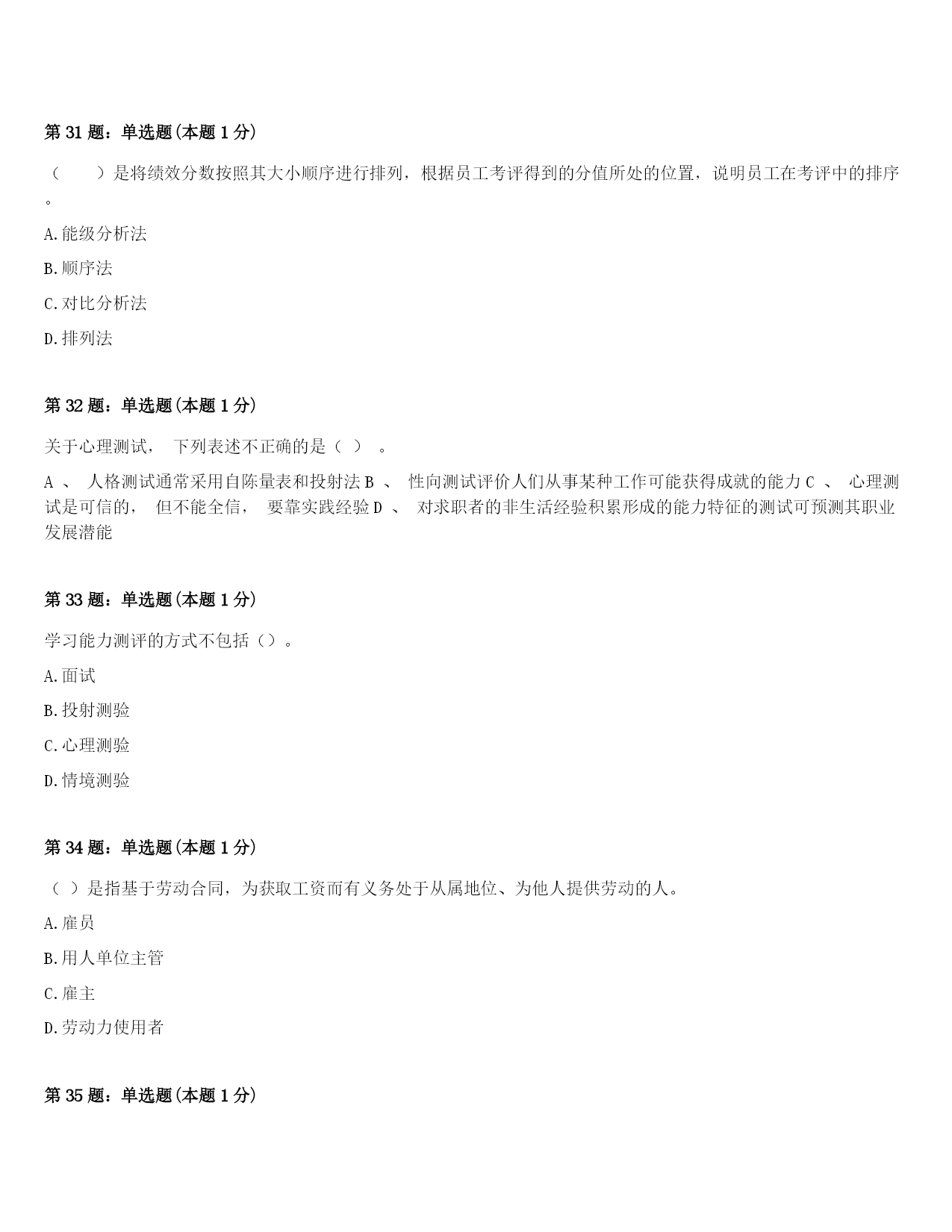 2024年鹰手营子矿区四级人力资源管理师《理论知识》高分冲刺试卷完整版第1题:单选题(本题1分)以下不符合用人单位预告解除劳动合同条件的是()。A.订立时所依据的客观情况发生重大变化,致劳动合同无法履行,经当事人协商未能就变更劳动合同内容达成一致协议的B.不能胜任工作,调整工作岗位后,仍不能胜任工作的C.非因工负伤、医疗期满后,不能从事原工作不能从事用人单位另行安排工作的D.患病或者非因工负伤,在规定医疗期内的第2题:单选题(本题1分)人力资本的投资者和受益者之间发生的收入和支出不对称现象,被称为人力资本