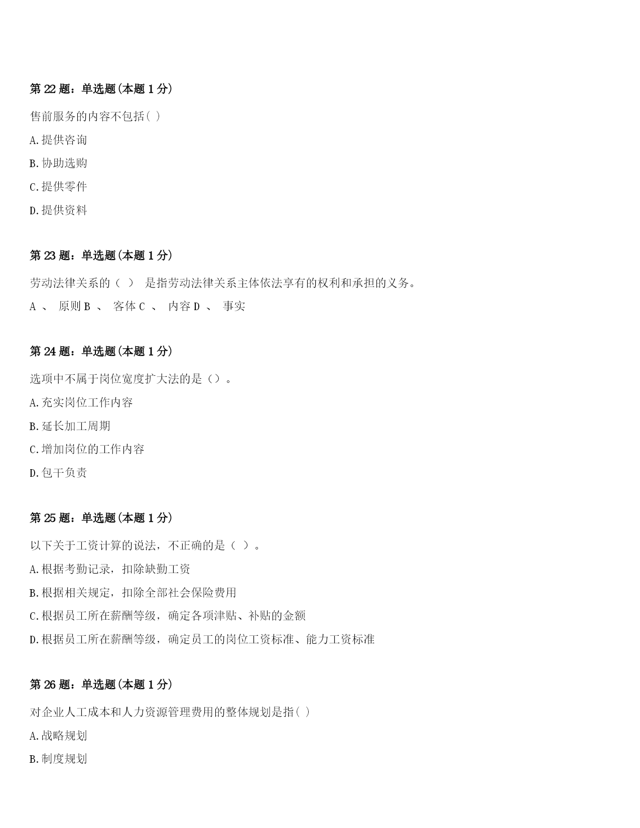 2024年鹰手营子矿区四级人力资源管理师《理论知识》高分冲刺试题完整版第1题:单选题(本题1分)企业中不同员工的能力有偏差,具体的工作分工也不同,因此员工培训要坚持()。A、战略性原则B、长期性原则C、多样性培训原则D、按需培训原则第2题:单选题(本题1分)根据《失业保险条例》,城镇企业、事业单位应按照本单位职工工资总额的()缴纳失业保险费。A.1%B.2%C.3%D.5%第3题:单选题(本题1分)工作岗位评价标准不包括()标准。A.指标的分级B.指标的量化C.评价的方法D.评价的流程第4题:单选题(本题