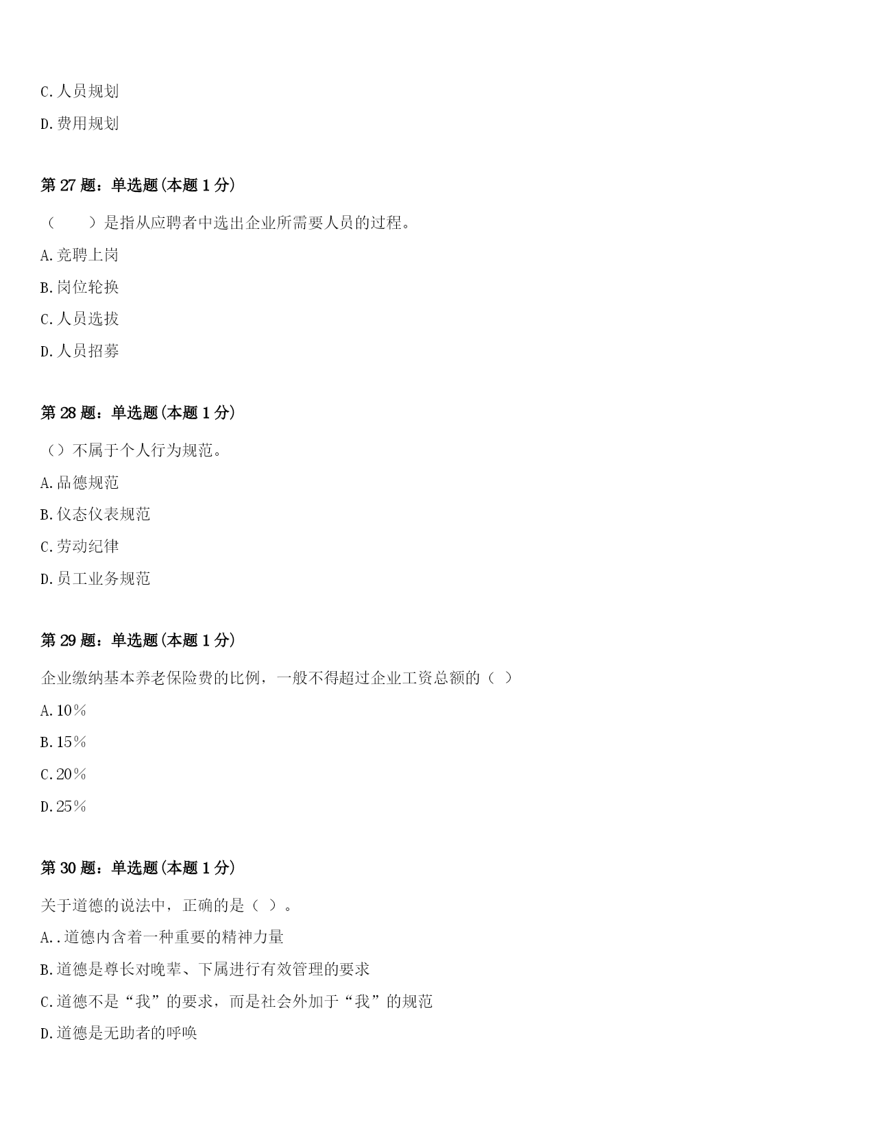 2024年矿区四级人力资源管理师《理论知识》高分冲刺试卷及答案第1题:单选题(本题1分)()是获得组织支持的重要途径之一。A.培训组织实施B.培训需求分析C.培训计划设计D.培训效果评估第2题:单选题(本题1分)对培训效果进行行为评估的方法不包括()。A.任务项目法B.问卷调查法C.笔试法D.行为观察法第3题:单选题(本题1分)免费提供法律咨询和员工心理健康咨询等属于()A.经济性福利B.直接薪酬C.非经济性福利D.津贴和补贴第4题:单选题(本题1分)人力资源费用支出控制的基本原则不包括()。A.及时性B