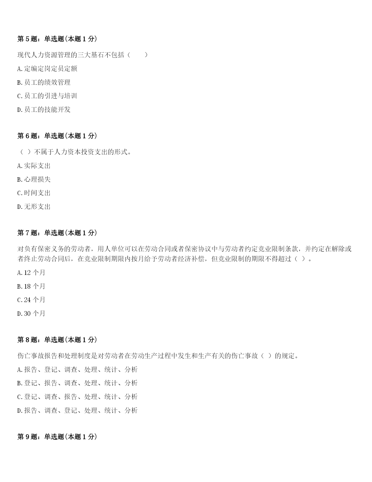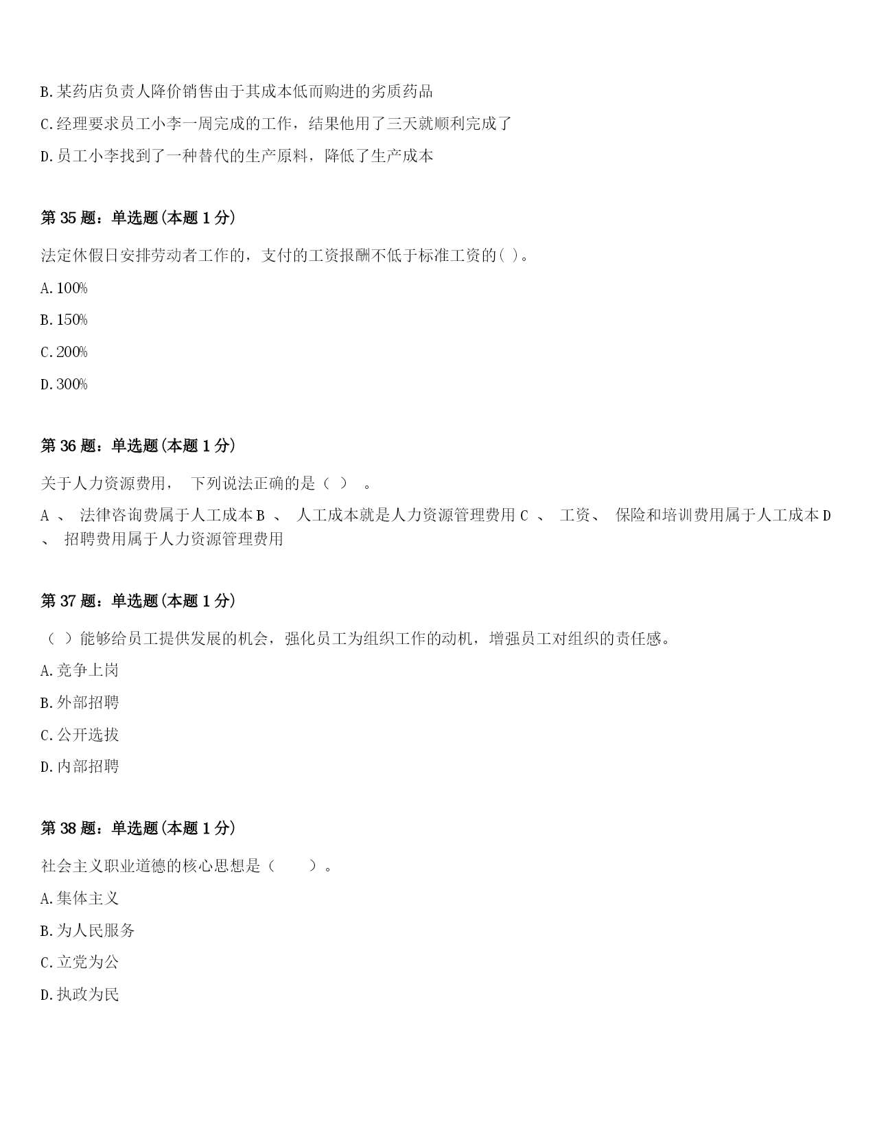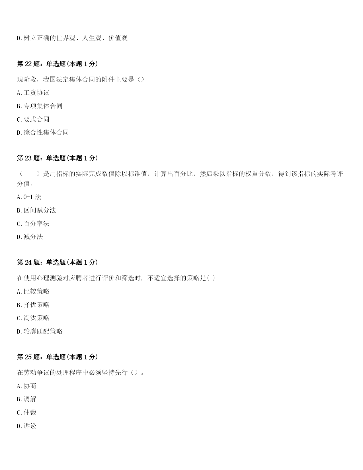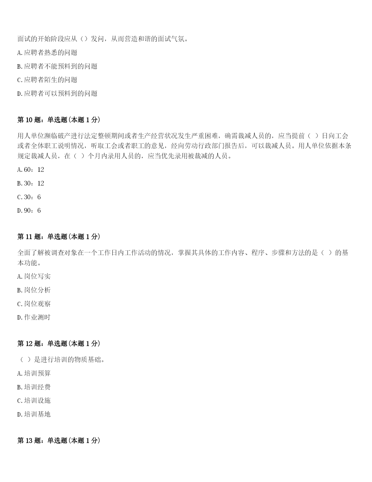 2024年蒲县四级人力资源管理师《理论知识》考前冲刺试卷及答案第1题:单选题(本题1分)薪酬满意度调查的步骤包括:①设计并发放调查表:②回收并处理调查表;③确定调查方式;④确定调查对象;⑤反馈调查结果;⑥确定调查内容。排序正确的是()。A.④③⑥①②⑤B.⑥④③①②⑤C.④⑥③①②⑤D.⑥③④①②⑤第2题:单选题(本题1分)用于说明企业劳动关系管理计划、目标、发布规定和管理标准的信息载体是()。A.汇总报表B.正式通报C.例会制度D.劳动管理表单第3题:单选题(本题1分)选项中不属于岗位宽度扩大法的是()