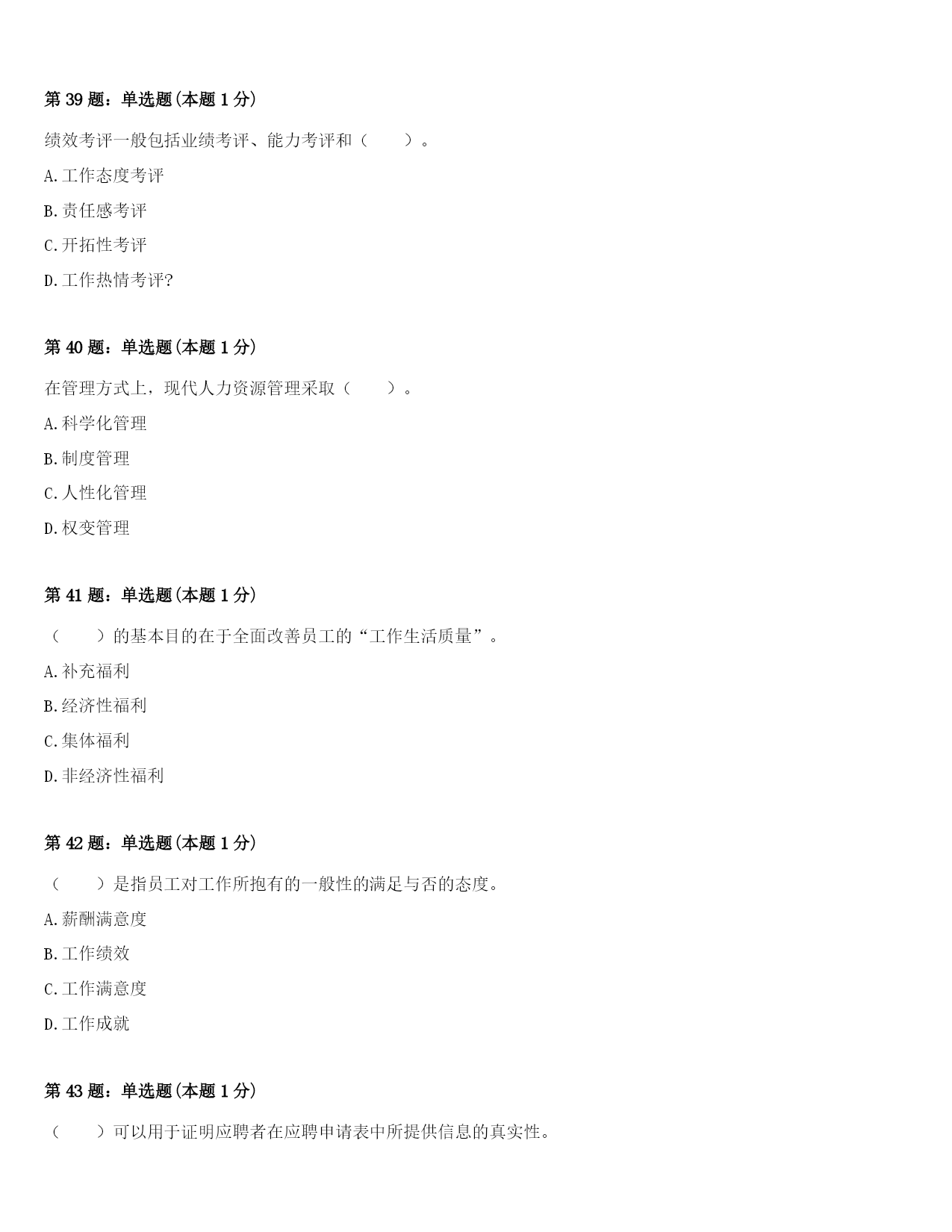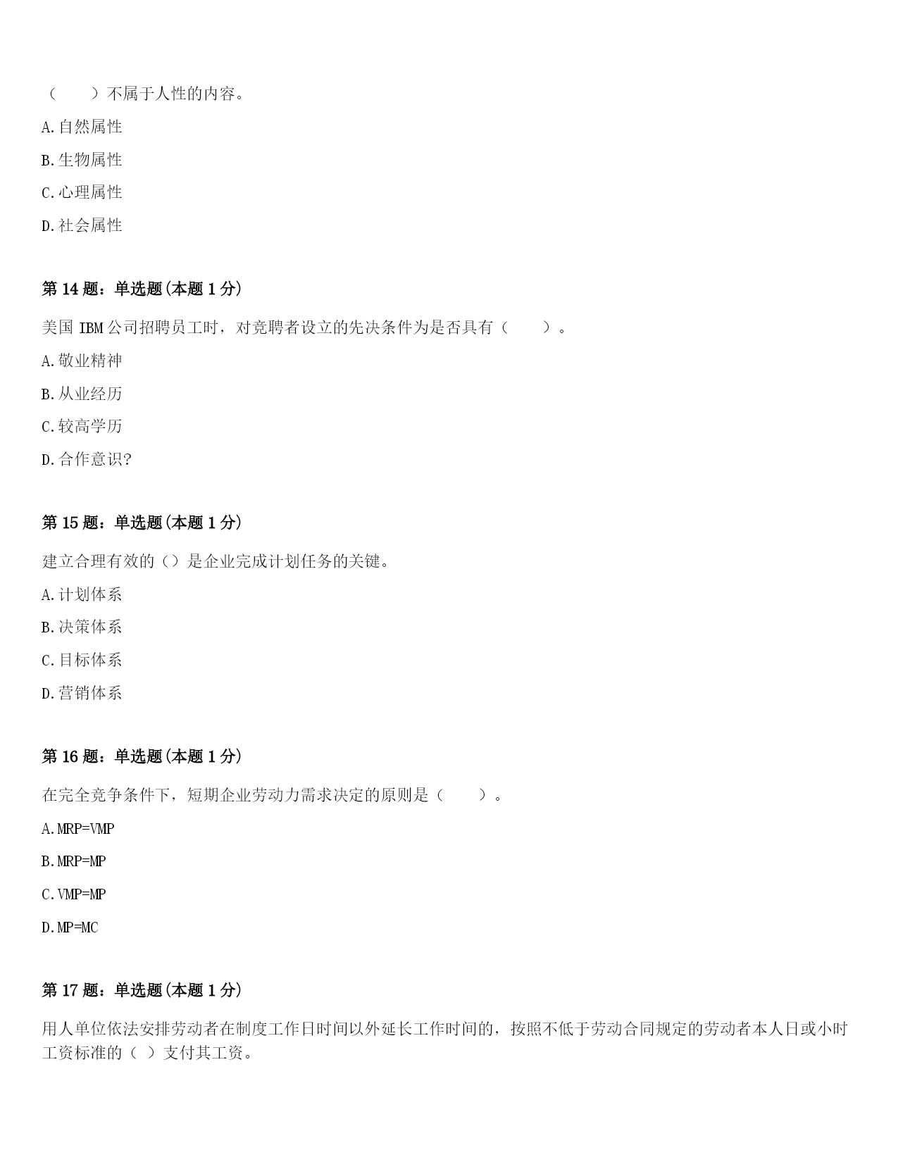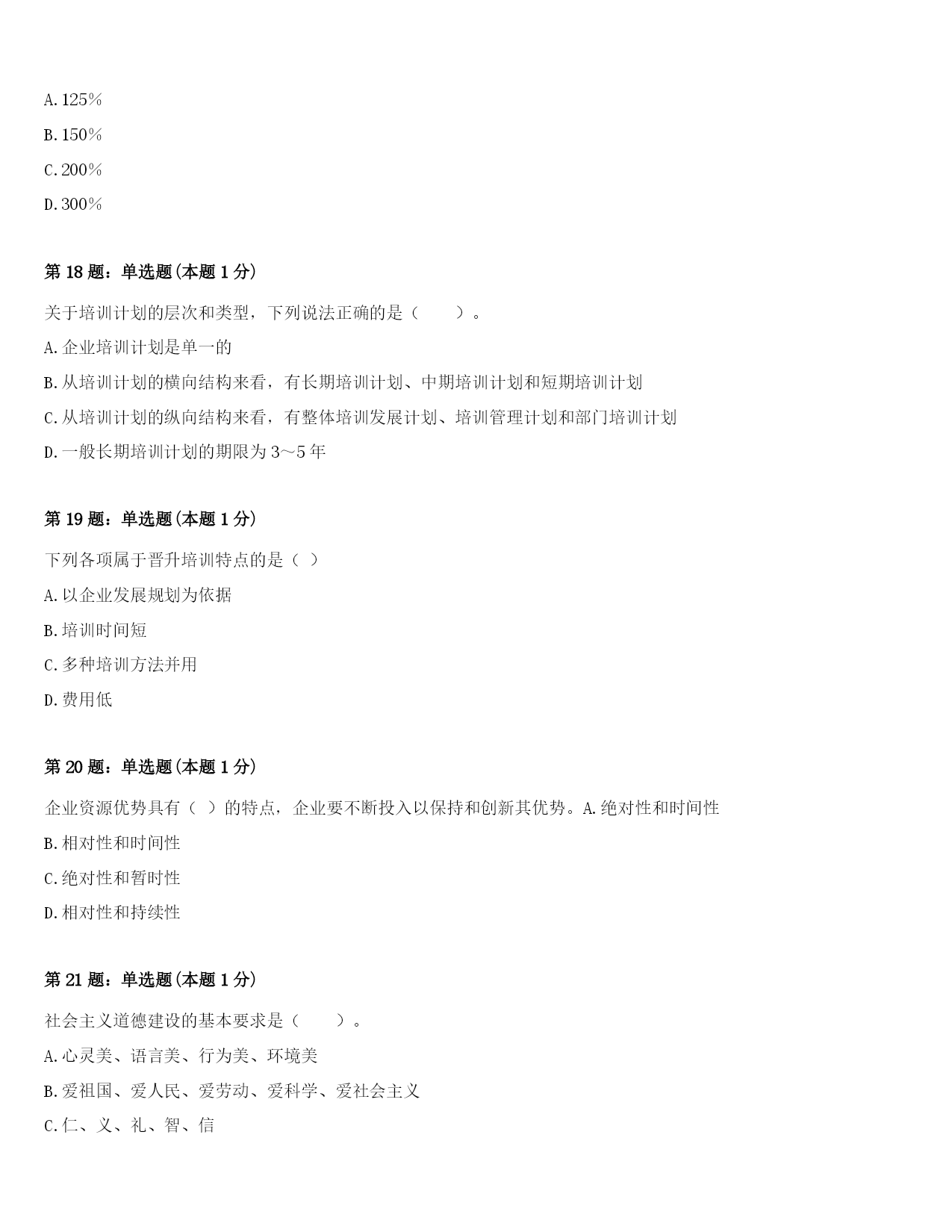 2024年蒲县四级人力资源管理师《理论知识》考前冲刺试卷含解析第1题:单选题(本题1分)我国计时工资制常用的具体形式不包括()。A.年工资制B.月工资制C.日工资制D.小时工资制第2题:单选题(本题1分)劳动合同双方当事人就已经订立的合同条款达成修改或补充的法律行为称为()。A.劳动合同的订立B.劳动合同的变更C.劳动合同的解除D.劳动合同的终止第3题:单选题(本题1分)以实现劳动关系双方的沟通,但不一定以达成协议为目的的企业民主管理制度是()。A.组织参与B.平等协商制度C.个人参与D.职工代表大会第4