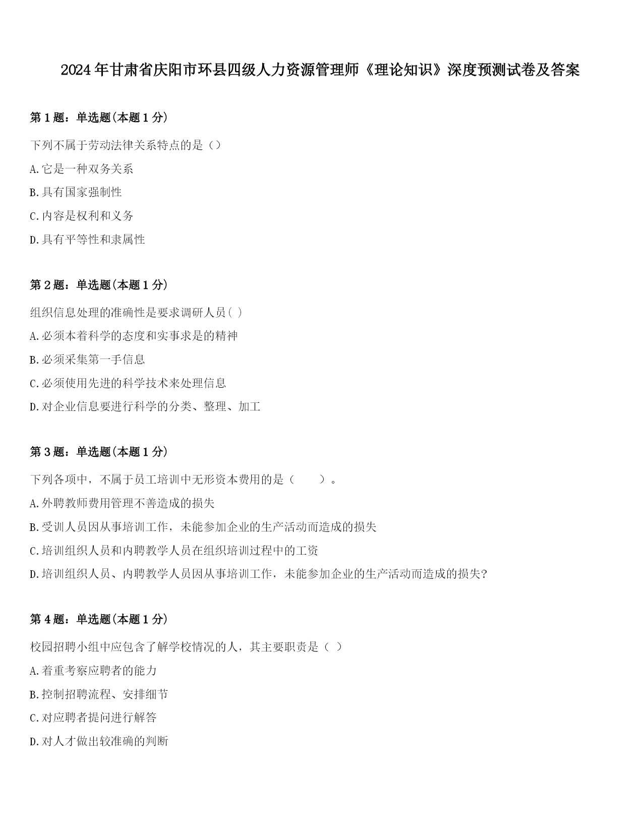 2024年甘肃省庆阳市环县四级人力资源管理师《理论知识》深度预测试卷完整版.docx