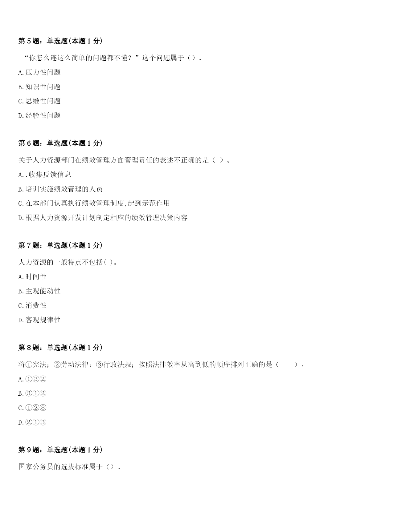 2024年甘肃省庆阳市环县四级人力资源管理师《理论知识》深度预测试卷及答案第1题:单选题(本题1分)下列不属于劳动法律关系特点的是()A.它是一种双务关系B.具有国家强制性C.内容是权利和义务D.具有平等性和隶属性第2题:单选题(本题1分)组织信息处理的准确性是要求调研人员()A.必须本着科学的态度和实事求是的精神B.必须采集第一手信息C.必须使用先进的科学技术来处理信息D.对企业信息要进行科学的分类、整理、加工第3题:单选题(本题1分)下列各项中,不属于员工培训中无形资本费用的是()。A.外聘教师费用管