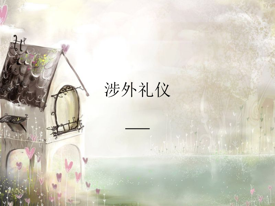 绪论涉外礼仪一、涉外礼仪原则(一)不卑不亢(二)入乡随俗(三)尊重隐私(四)女士优先二、主要的打招呼礼仪点头礼合十礼举手礼标准的军人举手礼(上体正直,右手取捷径迅速抬起,五指并拢自然伸直,中指微接帽檐右角前与眉同高,手心向下,微向外张,手腕不得弯曲,右大臂略平,与两肩略成一线,同时注视受礼者。)吻手礼2.正确做法男士行至已婚女士面前,首先垂首立正致意,然后以右手或双手捧起女士的右手,俯首用自己微闭的嘴唇,去象征性地轻吻一下其指背。男子同上层社会贵族妇女相见时,如果女方先伸出手作下垂式,男方则可将指尖轻轻提