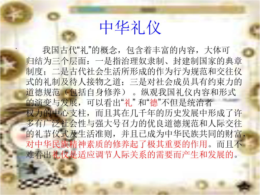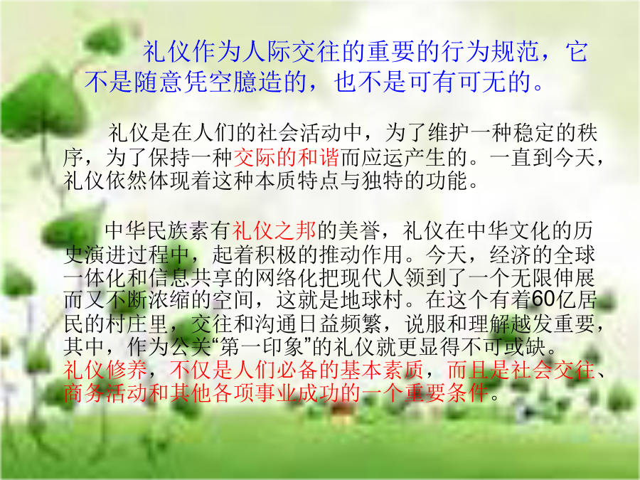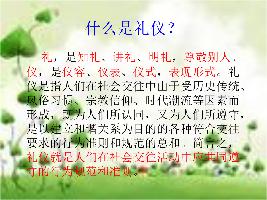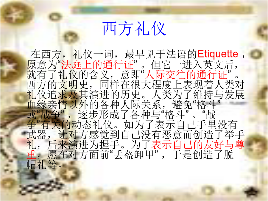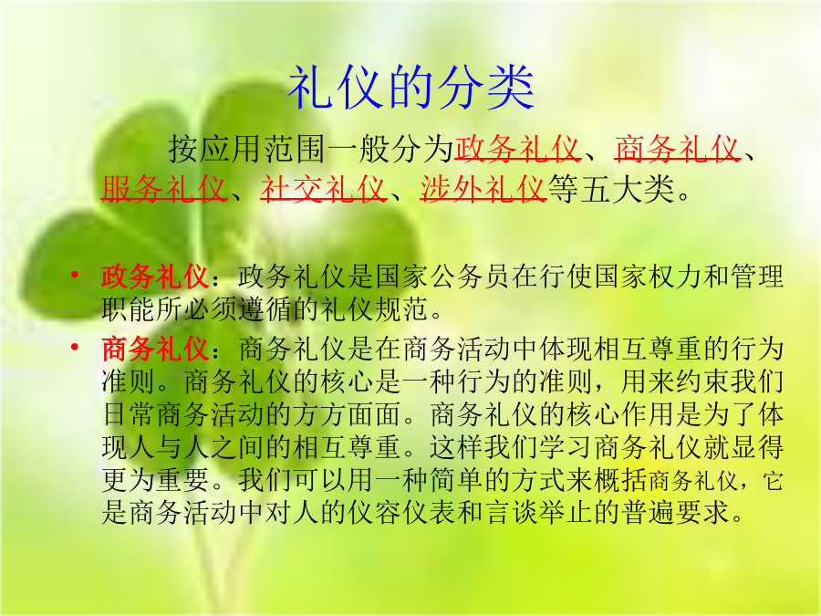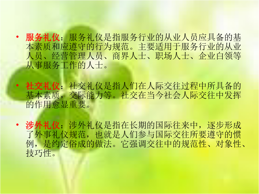 涉外礼仪什么是礼仪?礼仪作为人际交往的重要的行为规范,它不是随意凭空臆造的,也不是可有可无的。中华礼仪西方国家是非常注重礼仪的与外国人交涉可以让更多人了解我们中国的文化,有利于两国之间友好关系的发展所以,为了尊重外国友人,也为了使自己也受到尊重,我们应该多了解涉外礼仪,以免在与外国人交往时出现了不和谐的画面。西方礼仪礼仪的分类服务礼仪:服务礼仪是指服务行业的从业人员应具备的基本素质和应遵守的行为规范。主要适用于服务行业的从业人员、经营管理人员、商界人士、职场人士、企业白领等从事服务工作的人士。社交礼仪:社