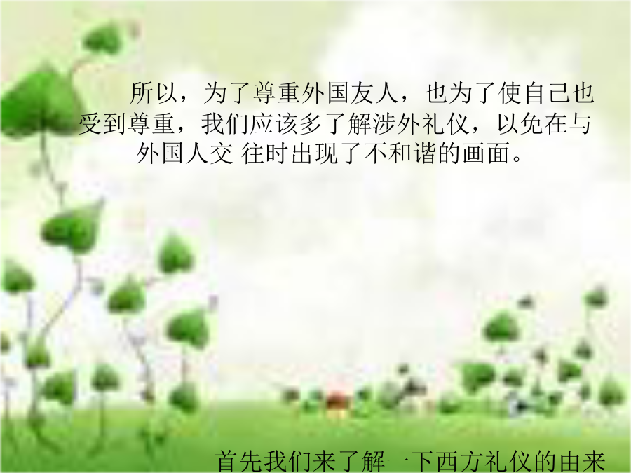第八章涉外礼仪案例:法国一家公司的经理邀请日本商人到自己家做客。在宴席上,主妇端上洗手指用的水,这个日本商人一时大意,竟然把碗中的水喝下去丁,主人看到后,马上就向同坐的孩子们示意,两个孜于也就一声不响地跟暑喝下了洗手指碗中的水,顾全了对方的面子.此后,双方不仅在生意往来上有很好的合作,私底下还成为关系不错的朋友。第一节涉外礼仪原则和禁忌案例问候的学问中方某公司代表与荚方某公司代表就业务合作问题进行洽谈,张先生见美方代表史密斯先生脸色不大好,像是生病了,于是在休息期间,张先生非常关切地问候史密斯先生“您怎么