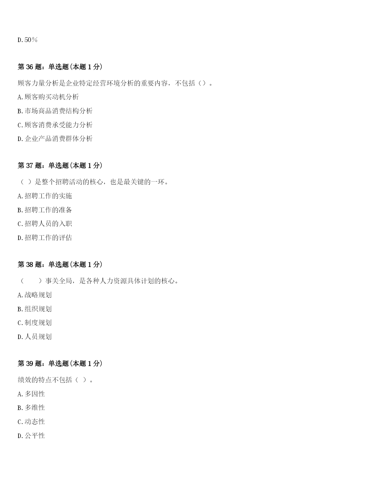 2024年黟县四级人力资源管理师《理论知识》押题密卷及答案第1题:单选题(本题1分)自学作为一种培训方式,其优点不包括()。A.学习费用低B.学习者自主性很强C.不影响工作D.学习内容不受限制第2题:单选题(本题1分)企业内部劳动关系管理制度制定的主体是()。A.国家B.企业主管部门C.企业D.企业与工会第3题:单选题(本题1分)()是员工测评与选拔活动的中心与纽带。A.设计测评表B.确定测评者C.选定测评方式D.设计测评与选拔标准体系第4题:单选题(本题1分)直线制又称(),是一种最简单的集权制组织结构