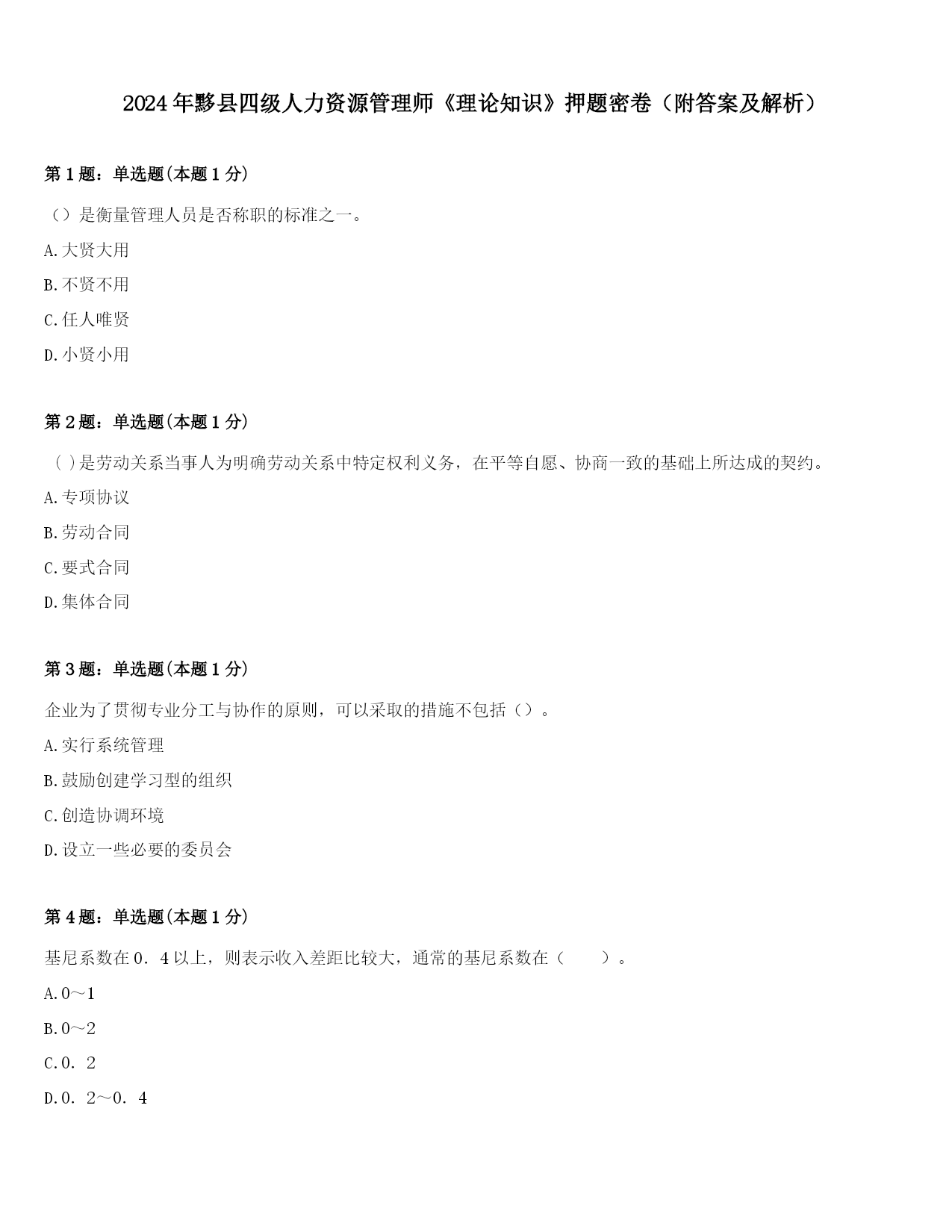 2024年黟县四级人力资源管理师《理论知识》押题密卷完整版.docx