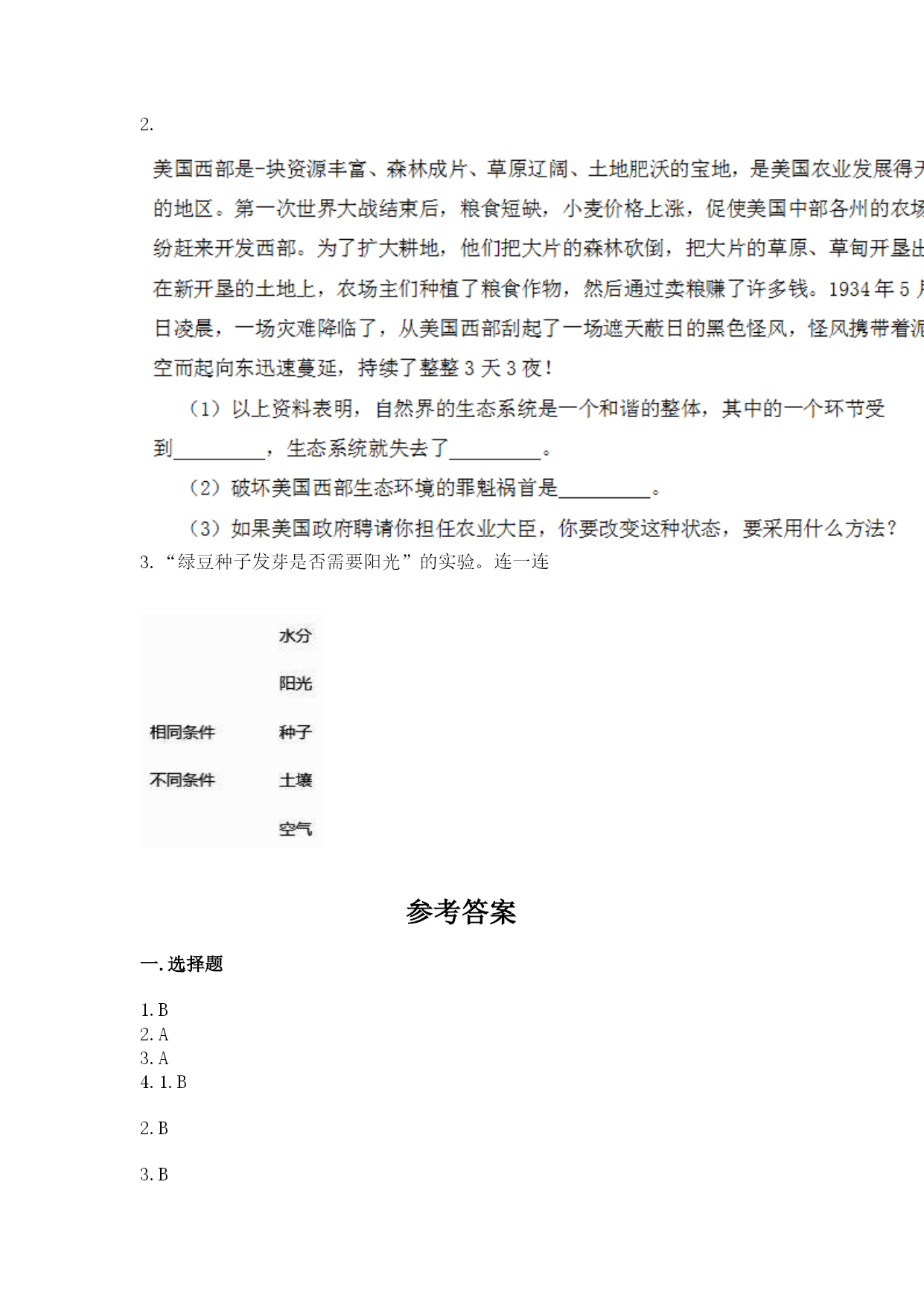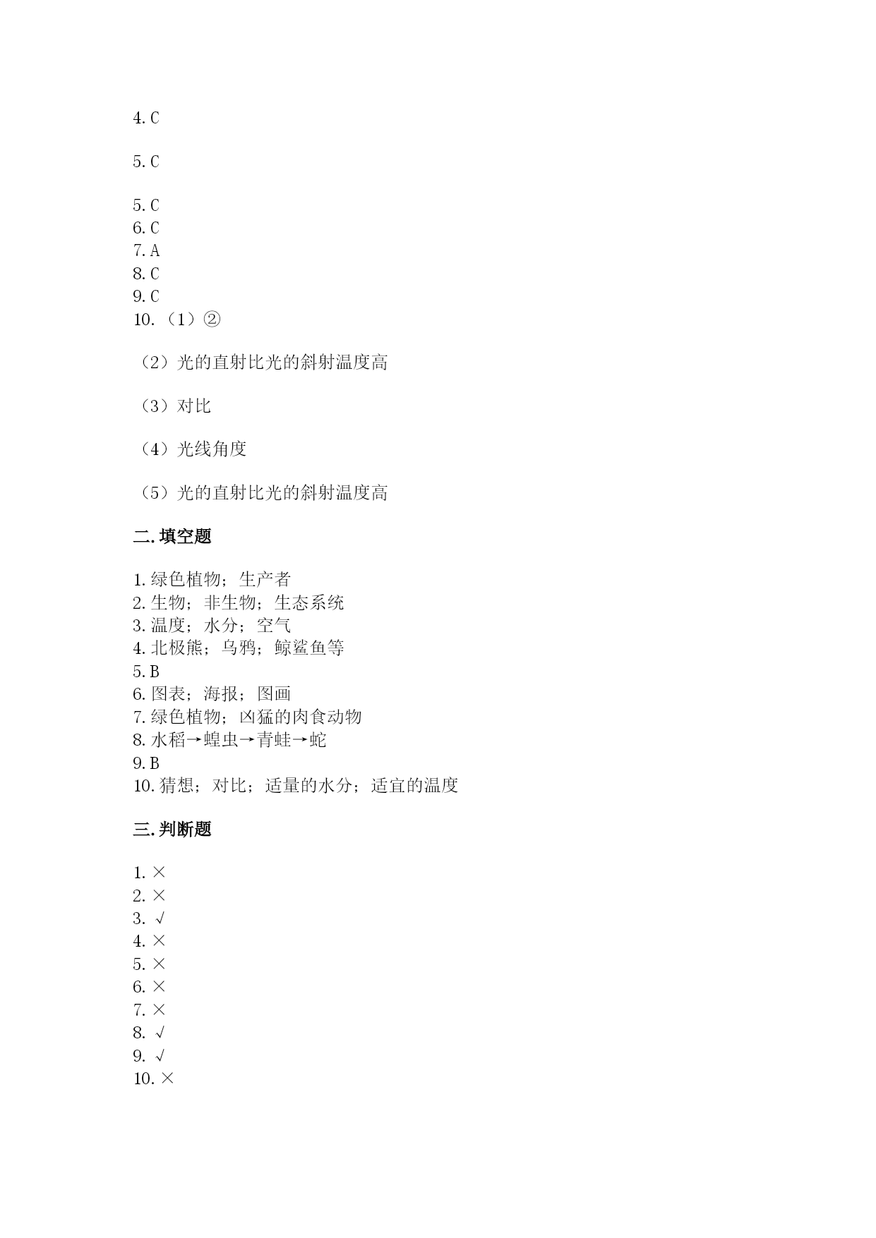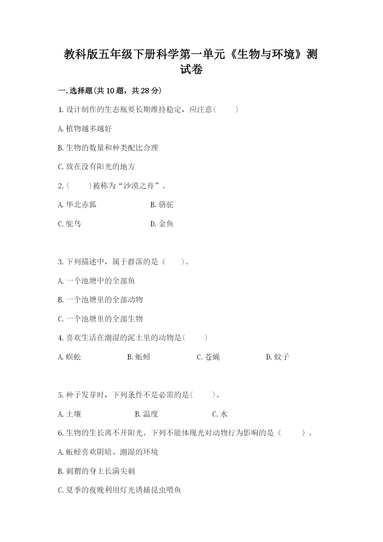 教科版科学五年级下册第一单元《生物与环境》测试卷一.选择题(共10题,共40分)1.下雨天,经常能够看到地面上有很多蚯蚓,这是因为()A.蚯蚓喜欢明亮的环境B.蚯蚓喜欢多水的C.土壤的空隙被雨水占据,氧气含量降低,蚯蚓需要爬到地面上来呼吸2.常温下两组相同的种子,一组种子受到光照,加适量的水,另一组种子用纸盒遮住,加很少的水。这个实验设计()。A.是科学的B.是不科学的C.我不知道3.下列描述中,属于群落的是()。A.一个池塘中的全部鱼B.一个池塘里的全部动物C.一个池塘里的全部生物4.下列动物中可以通过