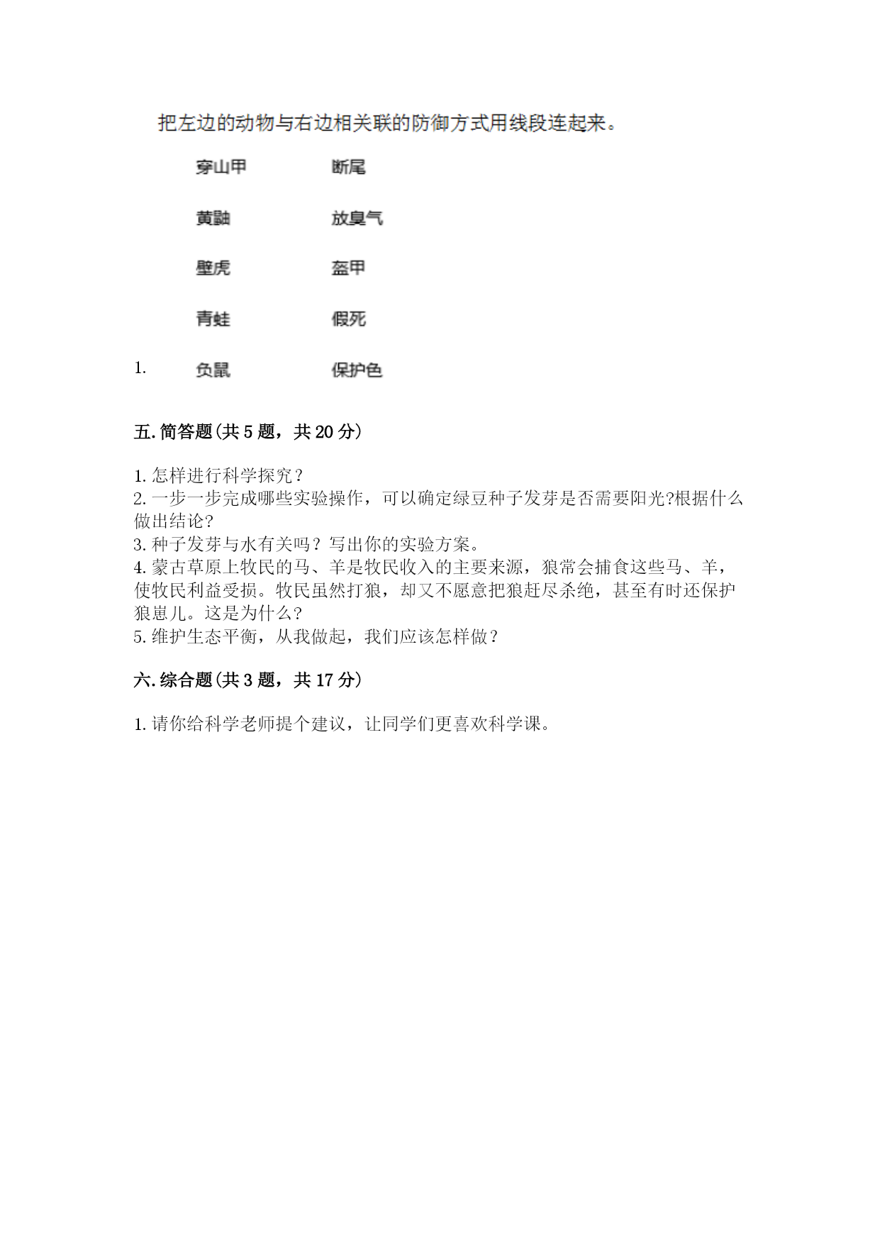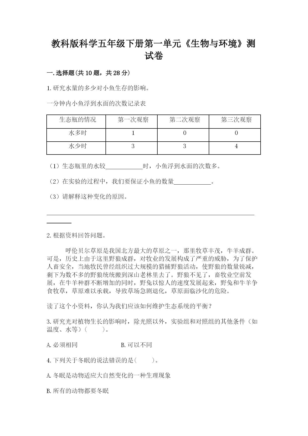教科版科学五年级下册第一单元《生物与环境》测试卷一.选择题(共10题,共28分)1.研究水量的多少对小鱼生存的影响。一分钟内小鱼浮到水面的次数记录表生态瓶的情况第一次观察第二次观察第三次观察水多时100水少时334(1)生态瓶里的水较时,小鱼浮到水面的次数多。(2)在实验的过程中,我们要保证小鱼的数量。(3)请解释这种变化的原因。2.根据资料回答问题。呼伦贝尔草原是我国北方最大的草原之一,那里牧草丰茂,牛羊成群。可是,历史上由于这里野狼成群,对牧业的发展构成了严重的威胁,为了保护人畜安全,当地牧民曾经组织