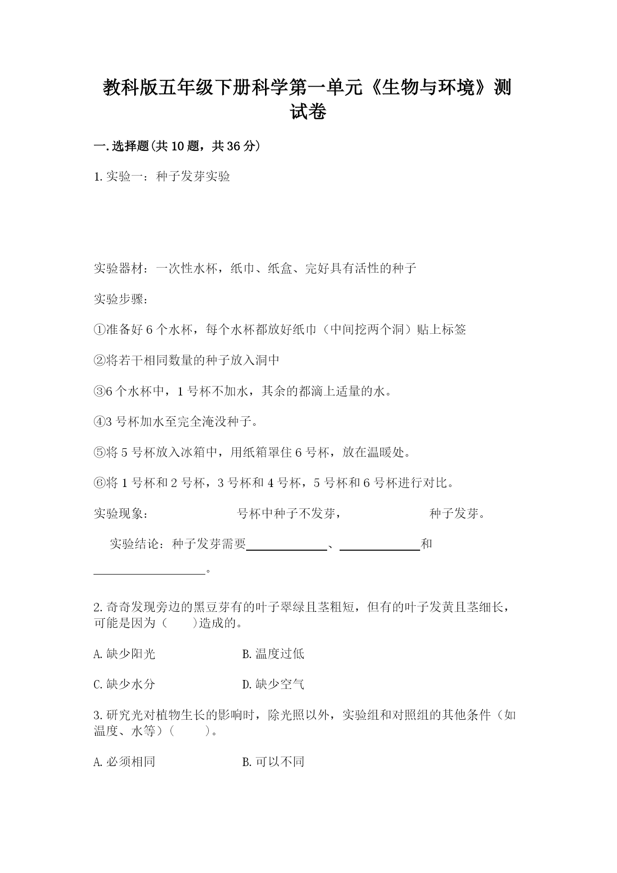 教科版科学五年级下册第一单元《生物与环境》测试卷一.选择题(共10题,共52分)1.根据“螳螂捕蝉,黄雀在后”的说法,我们可以写出食物链:()A.螳螂→蝉→黄雀B.蝉→螳螂→黄雀C.树汁→蝉→螳螂→黄雀2.种子萌发必须具备的条件是()。A.光照、温度、水、空气、土壤B.光照、温度、水、空气C.适宜的温度、水、空气3.有关绿豆发芽实验,下列叙述正确对是()A.绿豆发芽必须有土壤B.绿豆发芽时先长叶后长根C.绿豆芽的根朝着有水的方向生长4.在自然界,种子春天才开始萌发,这说明()。A.种子萌发需要一定的温度B