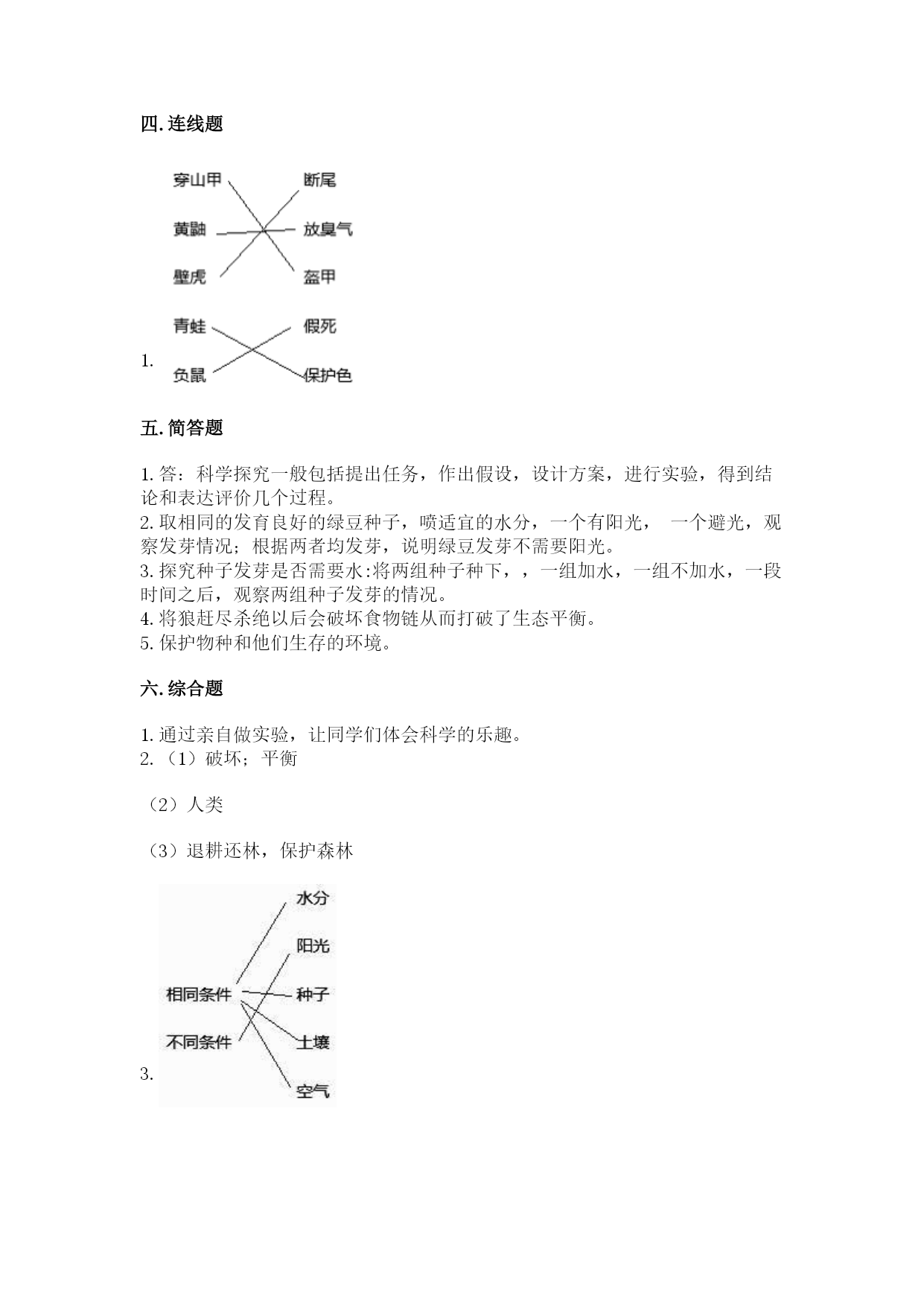 教科版五年级下册科学第一单元《生物与环境》测试卷一.选择题(共10题,共36分)1.实验一:种子发芽实验实验器材:一次性水杯,纸巾、纸盒、完好具有活性的种子实验步骤:①准备好6个水杯,每个水杯都放好纸巾(中间挖两个洞)贴上标签②将若干相同数量的种子放入洞中③6个水杯中,1号杯不加水,其余的都滴上适量的水。④3号杯加水至完全淹没种子。⑤将5号杯放入冰箱中,用纸箱罩住6号杯,放在温暖处。⑥将1号杯和2号杯,3号杯和4号杯,5号杯和6号杯进行对比。实验现象:号杯中种子不发芽,种子发芽。实验结论:种子发芽需要、和