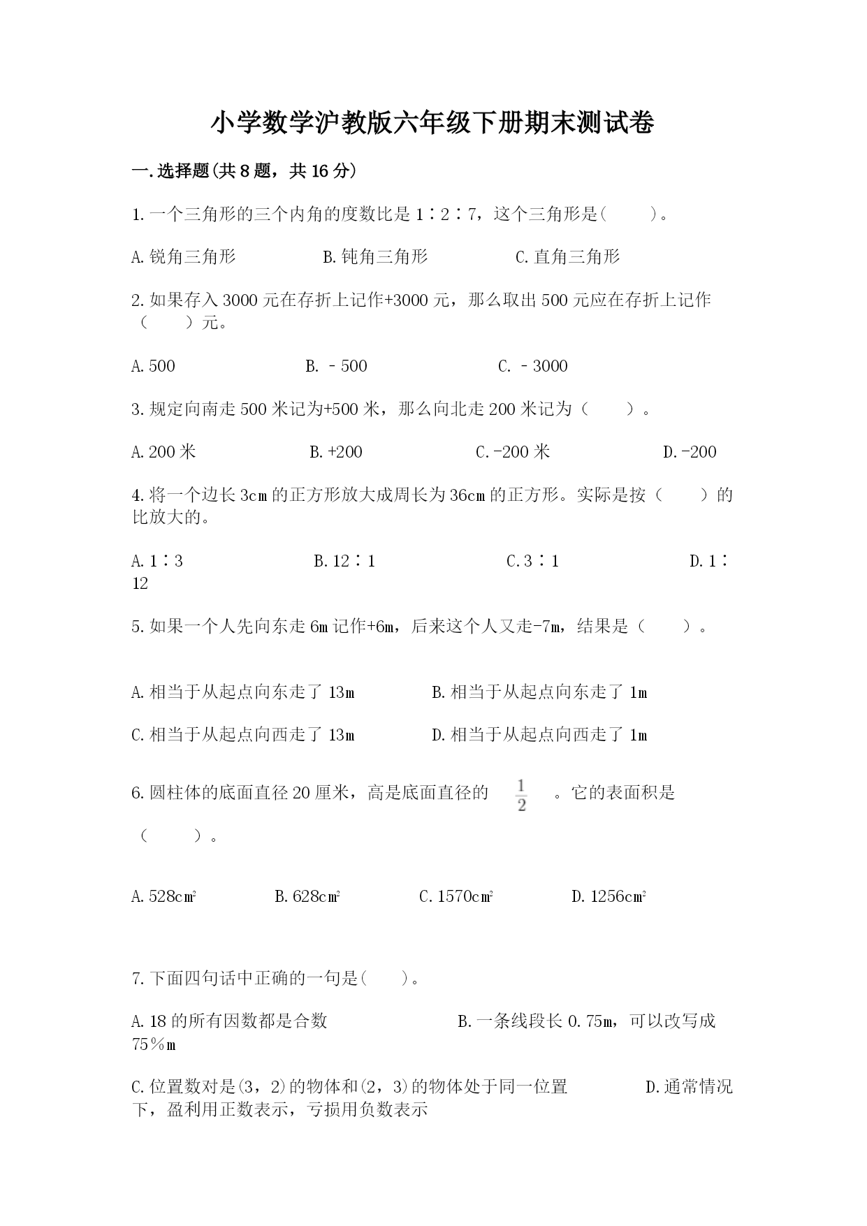 小学数学沪教版六年级下册期末测试卷一.选择题(共8题,共16分)1.一个三角形的三个内角的度数比是1∶2∶7,这个三角形是()。A.锐角三角形B.钝角三角形C.直角三角形2.如果存入3000元在存折上记作+3000元,那么取出500元应在存折上记作()元。A.500B.﹣500C.﹣30003.规定向南走500米记为+500米,那么向北走200米记为()。A.200米B.+200C.-200米D.-2004.将一个边长3cm的正方形放大成周长为36cm的正方形。实际是按()的比放大的。A.1∶3B.12∶