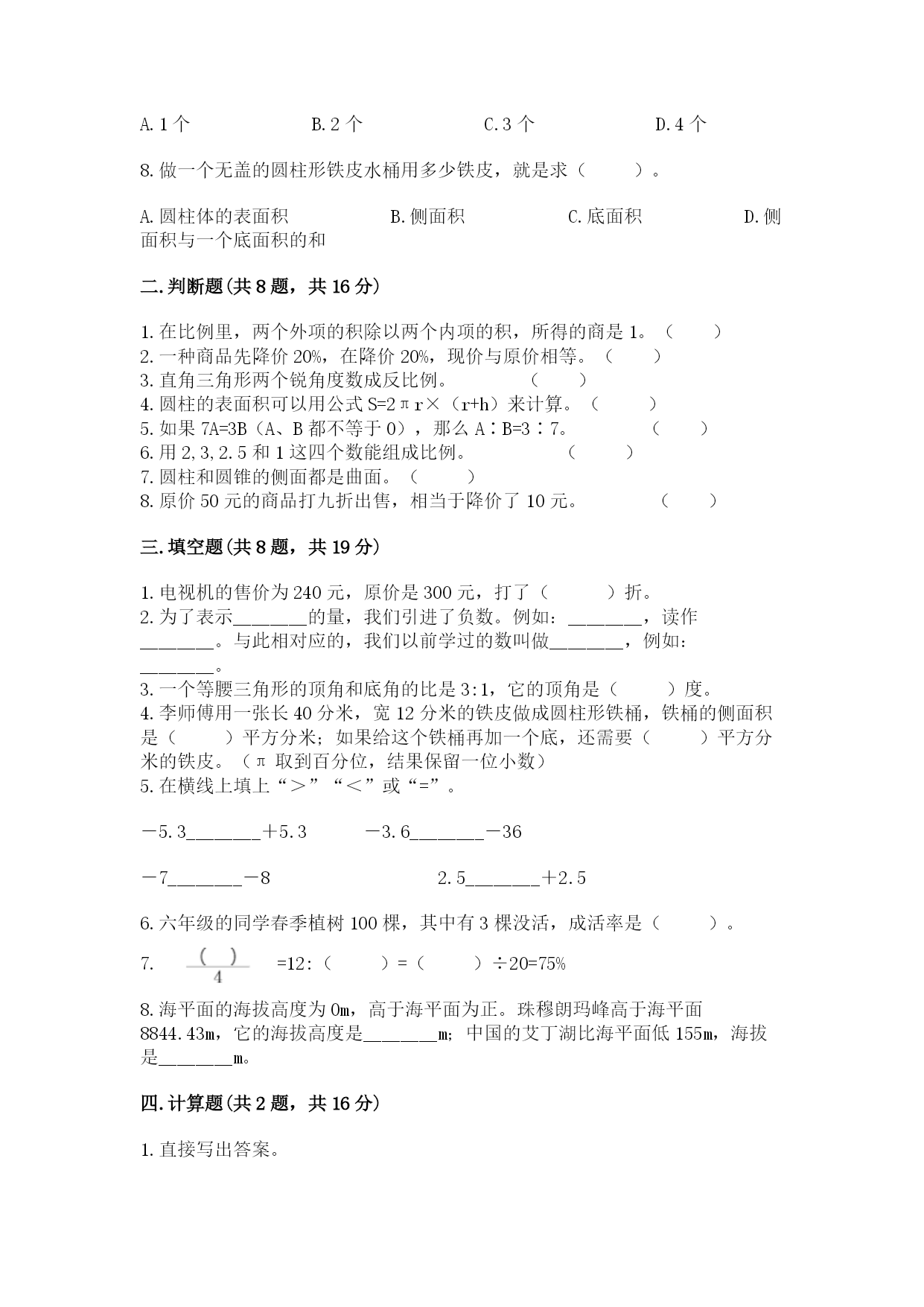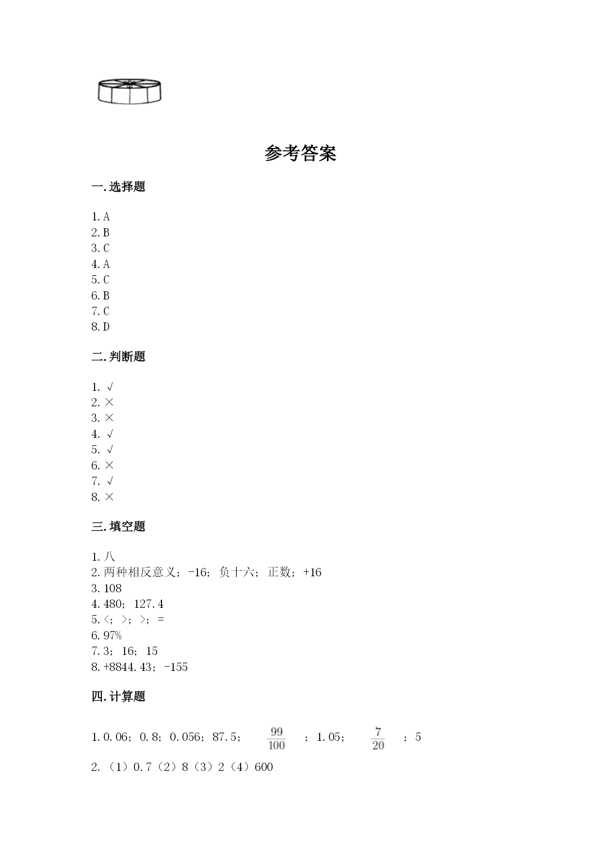 小学数学沪教版六年级下册期末测试卷一.选择题(共8题,共16分)1.一架客机从北京飞往上海,飞行速度和所用时间()。A.成正比例B.成反比例C.不成比例2.一件商品的进价是200元,加价20%作为定价.如果按定价的八折出售,售出这件商品()。A.赚了B.赔了C.不赚也不赔3.如果妈妈领取工资1500元记作+1500元,那么给“希望工程”捐款400元,可以记作()元。A.+400B.-400C.+1100D.-19004.在-2,-0.5,0,-0.01这四个数中,最大的负数是()。A.-2B.-0.5C.