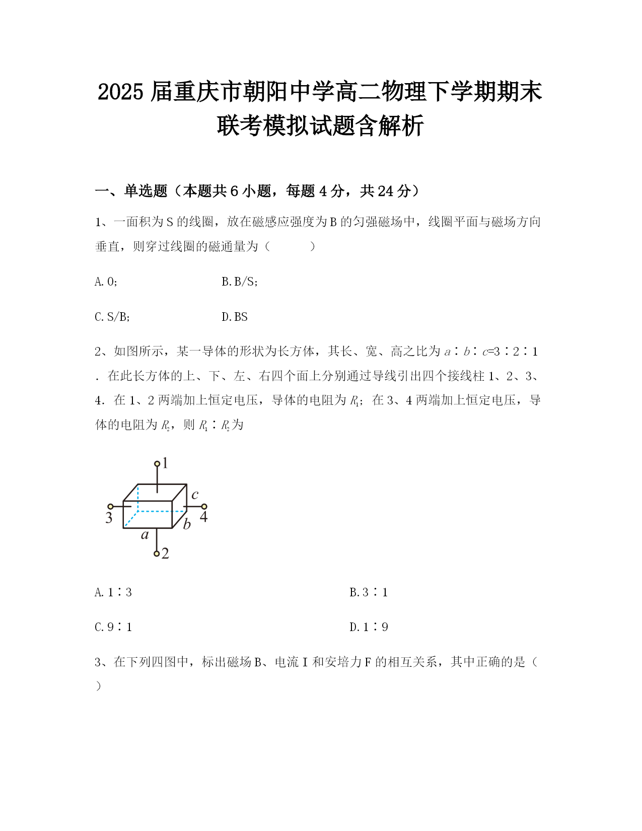 2025届重庆市朝阳中学高二物理下学期期末联考模拟试题含解析一、单选题(本题共6小题,每题4分,共24分)1、一面积为S的线圈,放在磁感应强度为B的匀强磁场中,线圈平面与磁场方向垂直,则穿过线圈的磁通量为()A.0;B.B/S;C.S/B;D.BS2、如图所示,某一导体的形状为长方体,其长、宽、高之比为a∶b∶c=3∶2∶1.在此长方体的上、下、左、右四个面上分别通过导线引出四个接线柱1、2、3、4.在1、2两端加上恒定电压,导体的电阻为R1;在3、4两端加上恒定电压,导体的电阻为R2,则R1∶R2为A.